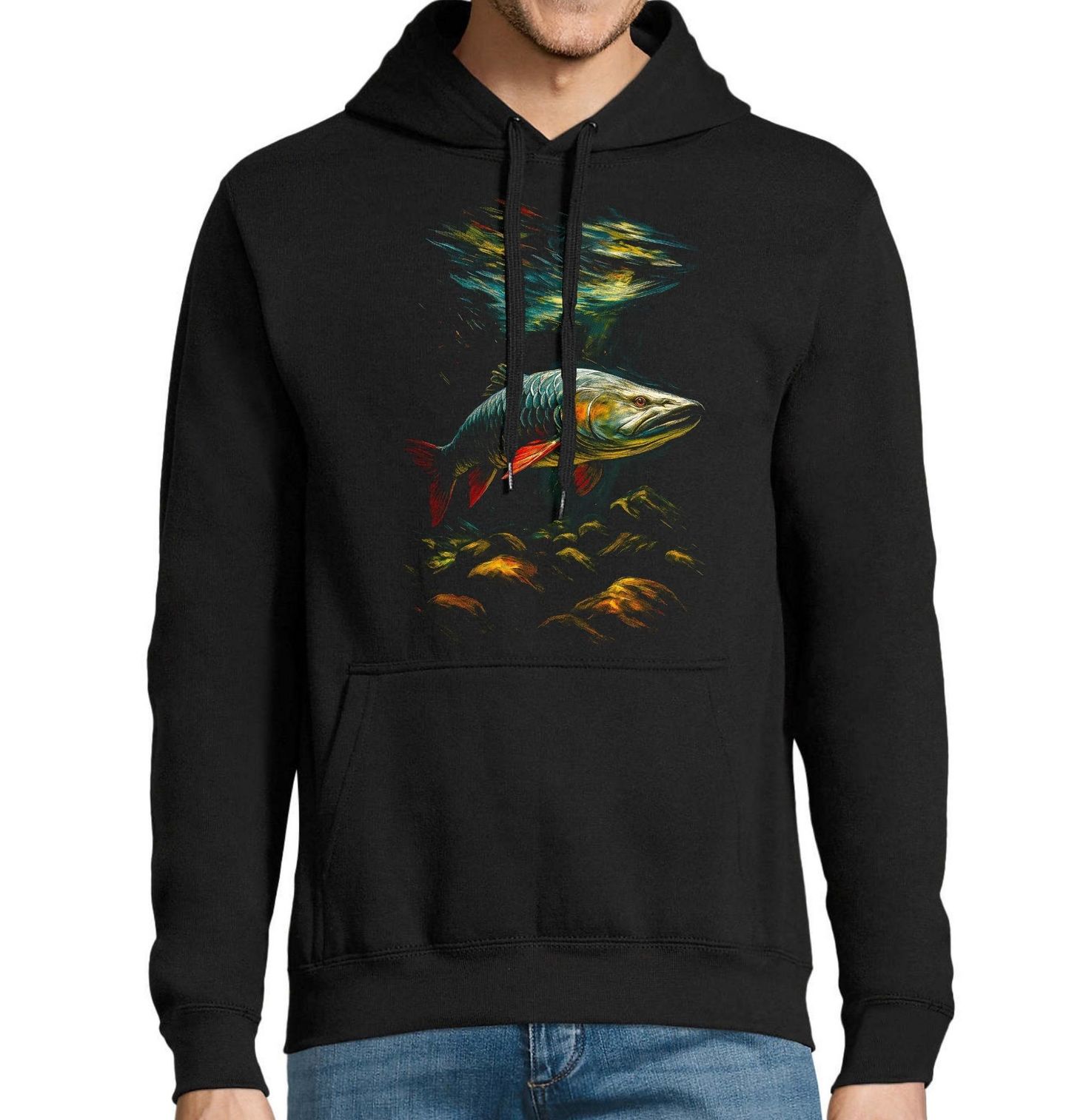 Pánská mikina Bolen dravý. Dynamický motiv zachycuje bolena dravého (Aspius aspius), jednoho z nejrychlejších a nejopatrnějších dravců našich řek. ento design osloví každého rybáře, pro kterého je rybaření výzvou, trpělivostí a respektem k vodě. Ideální motiv pro milovníky říčního lovu, dravých ryb a tichého napětí před záběrem.