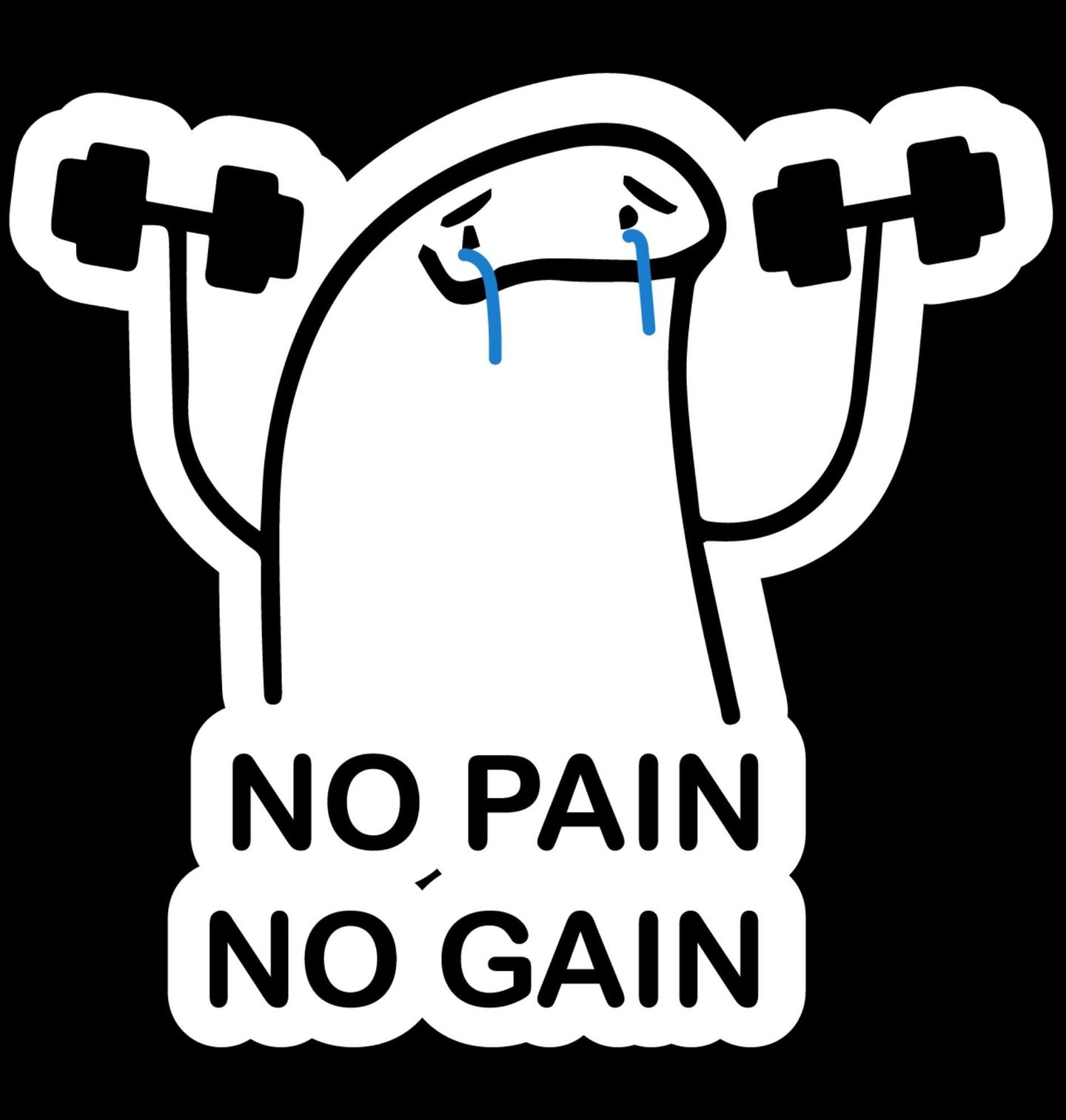 Pánské tričko Bolest k Úspěchu. Originální a zároveň vtipný motiv zobrazuje roztomilou postavičku, která zvedá činky, i když jí po tvářích tečou slzy. Pod ilustrací je známý motivační slogan „NO PAIN NO GAIN“, což znamená „Bez bolesti není zisk“. Design kombinuje humor s realitou tvrdého tréninku.