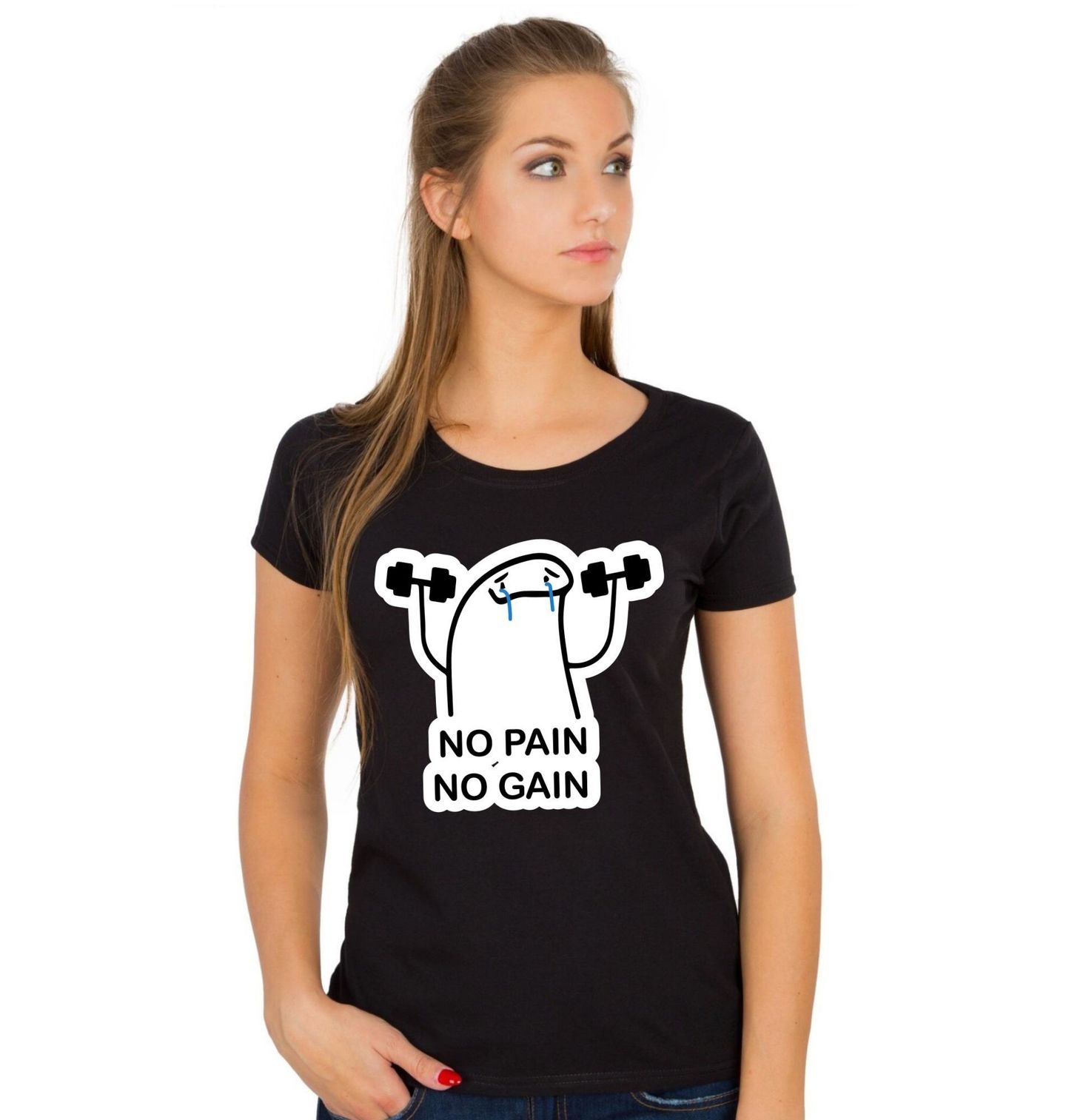 Dámské tričko Bolest k Úspěchu. Originální a zároveň vtipný motiv zobrazuje roztomilou postavičku, která zvedá činky, i když jí po tvářích tečou slzy. Pod ilustrací je známý motivační slogan „NO PAIN NO GAIN“, což znamená „Bez bolesti není zisk“. Design kombinuje humor s realitou tvrdého tréninku.
