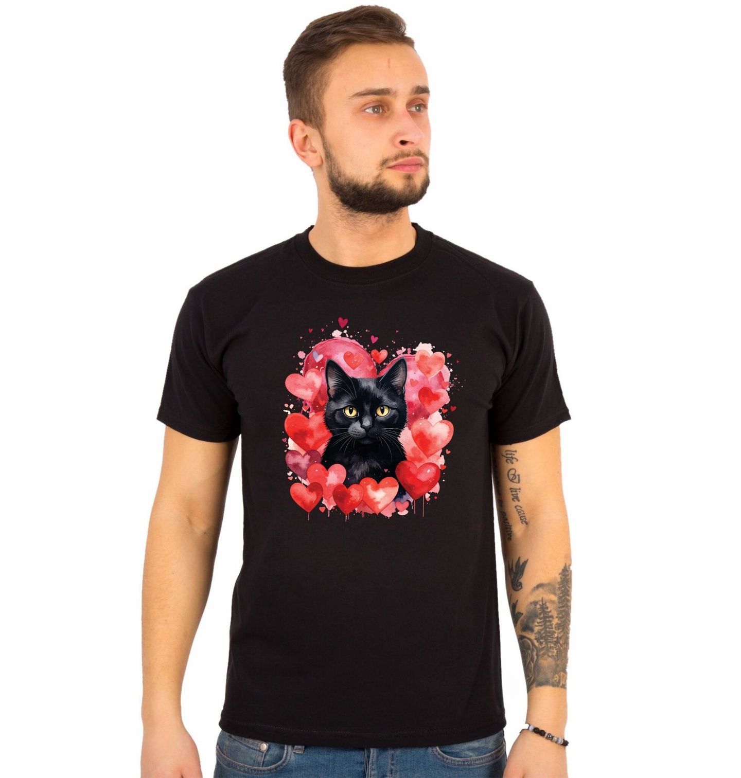 Pánské tričko Bombajská Kočka mezi Srdci. Bombajové jsou lesklé pevné černé kočky se svalnatou postavou a mají charakteristické velké světlé měděně zlaté oči. Plemeno je pojmenováno po indickém městě Bombaji s odkazem na lokalitu indického černého leoparda. Akvarelové srdce plné červených tónů podtrhuje láskyplný charakter motivu a dělá z něj ideální design pro všechny milovníky černých koček.