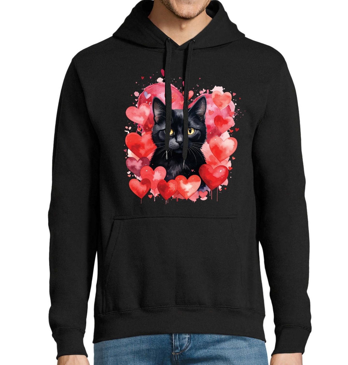 Pánská mikina Bombajská Kočka mezi Srdci. Bombajové jsou lesklé pevné černé kočky se svalnatou postavou a mají charakteristické velké světlé měděně zlaté oči. Plemeno je pojmenováno po indickém městě Bombaji s odkazem na lokalitu indického černého leoparda. Akvarelové srdce plné červených tónů podtrhuje láskyplný charakter motivu a dělá z něj ideální design pro všechny milovníky černých koček.