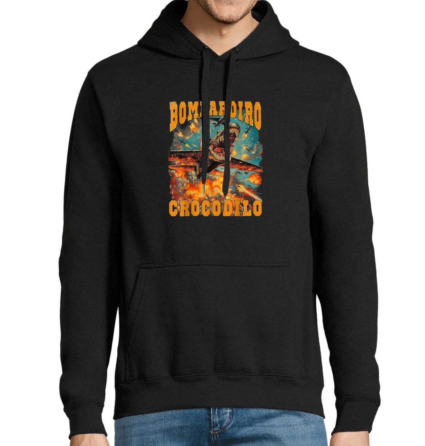Pánská mikina Bombardiro Crocodilo ve Válce. Tohle je bombardér, co není jen letadlo – má zuby, oči plné hněvu a tělo, které doslova vře výbuchem. Krokodýlí bombardér se řítí oblohou nad ohnivým peklem a nezná slitování. Perfektní volba pro fanoušky meme estetiky, co chtějí něco mezi válečným plakátem, krokodýlím kaiju a čistým šílenstvím.