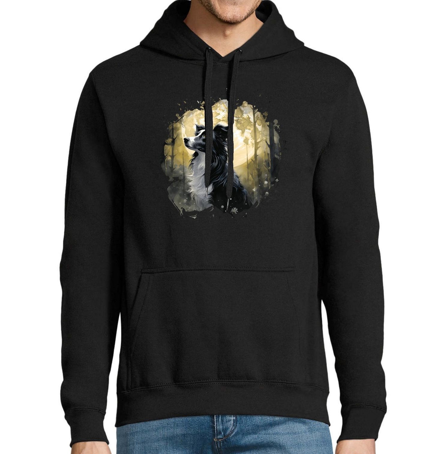 Pánská mikina Border kolie v Záři Měsíce. Ilustrace psa rasy Border kolie v magickém zlatavém lese pod úplňkem je perfektní volbou pro každého pejskaře, který miluje eleganci, přírodu a oddanost. Tento pes, Border kolie, je známý svou inteligencí a věrností – a právě tyto vlastnosti z něj dělají ideálního společníka i v těch nejtišších chvílích pod hvězdnou oblohou.