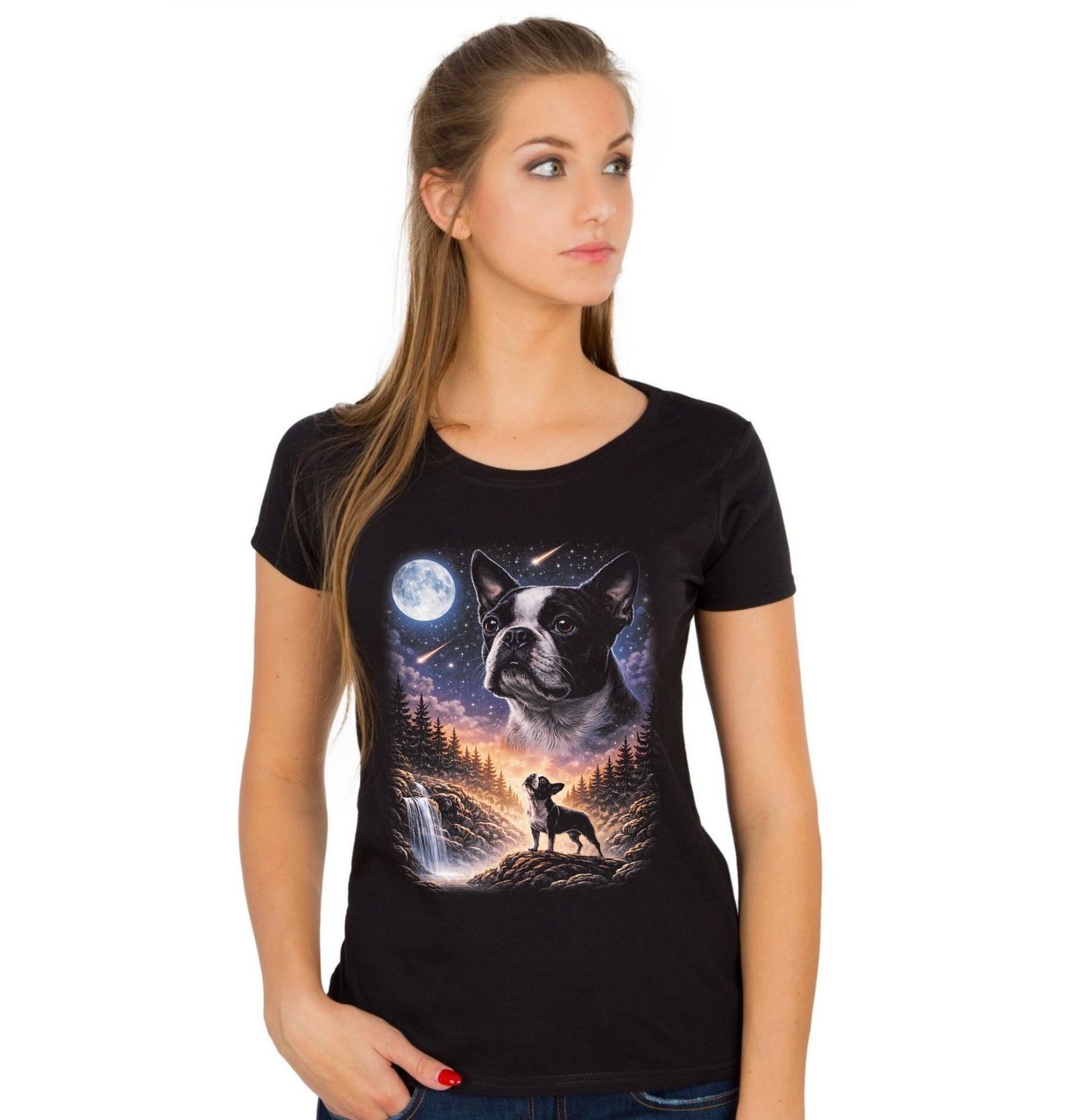 Dámské tričko Bostonský teriér a Kouzlo Úplňku. Tento design je ideální pro každého pejskaře, který miluje svého čtyřnohého parťáka a chce vyjádřit jeho oddanost, sílu a jedinečnou osobnost. Kombinace lesa, hvězdné oblohy a tajemné atmosféry vytváří silný a emotivní vizuální zážitek. Tento hrdým pes pod měsícem symbolizuje ochranu, věrnost a klid.