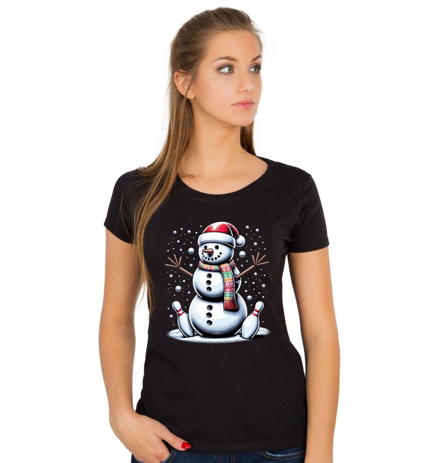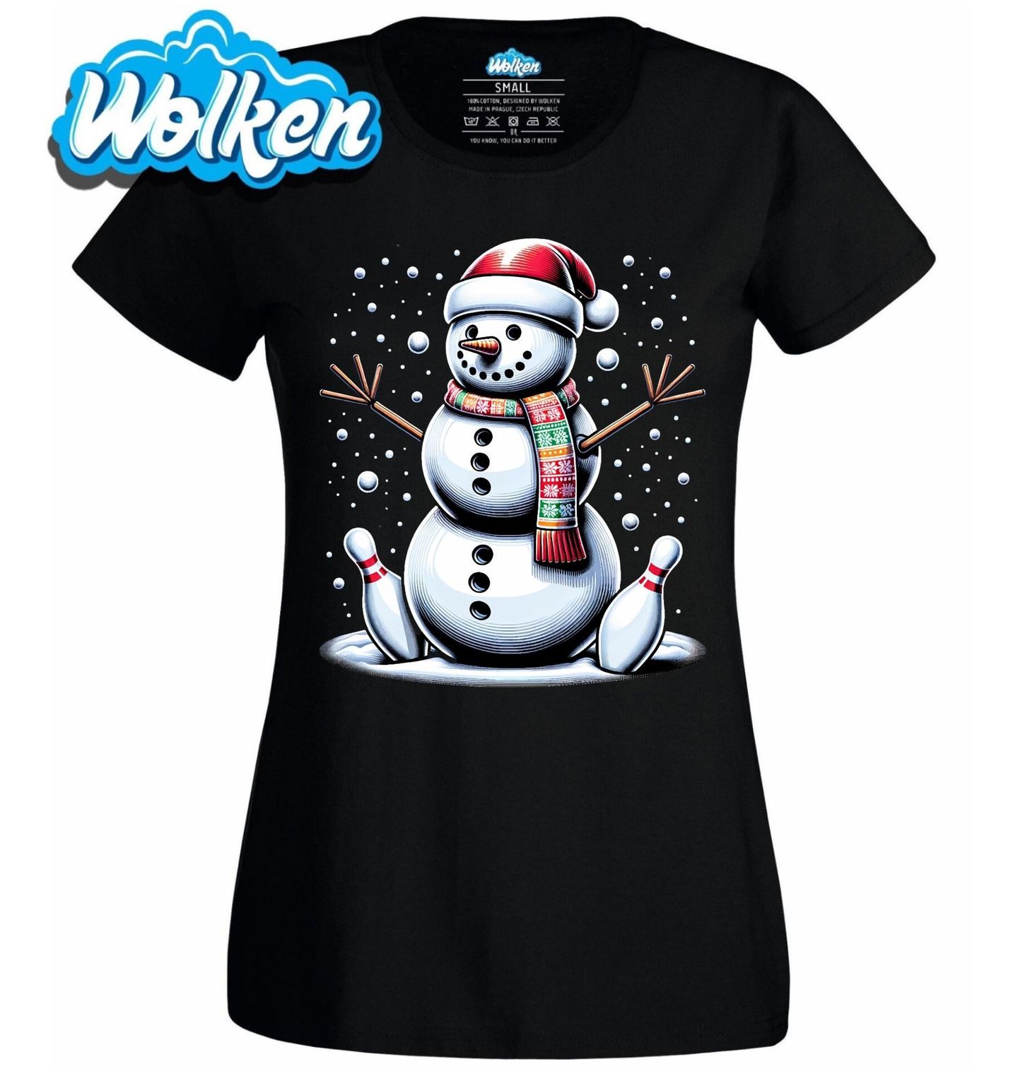 Dámské tričko Bowlingový Sněhulák mezi Kuželkami. Sněhulák v čepici a šále je postavený přímo z bowlingových koulí a kolem něj stojí kuželky připravené na strike. Perfektní dárek pro každého, kdo miluje bowling a chce mít sváteční výzdobu i v trochu sportovním stylu.