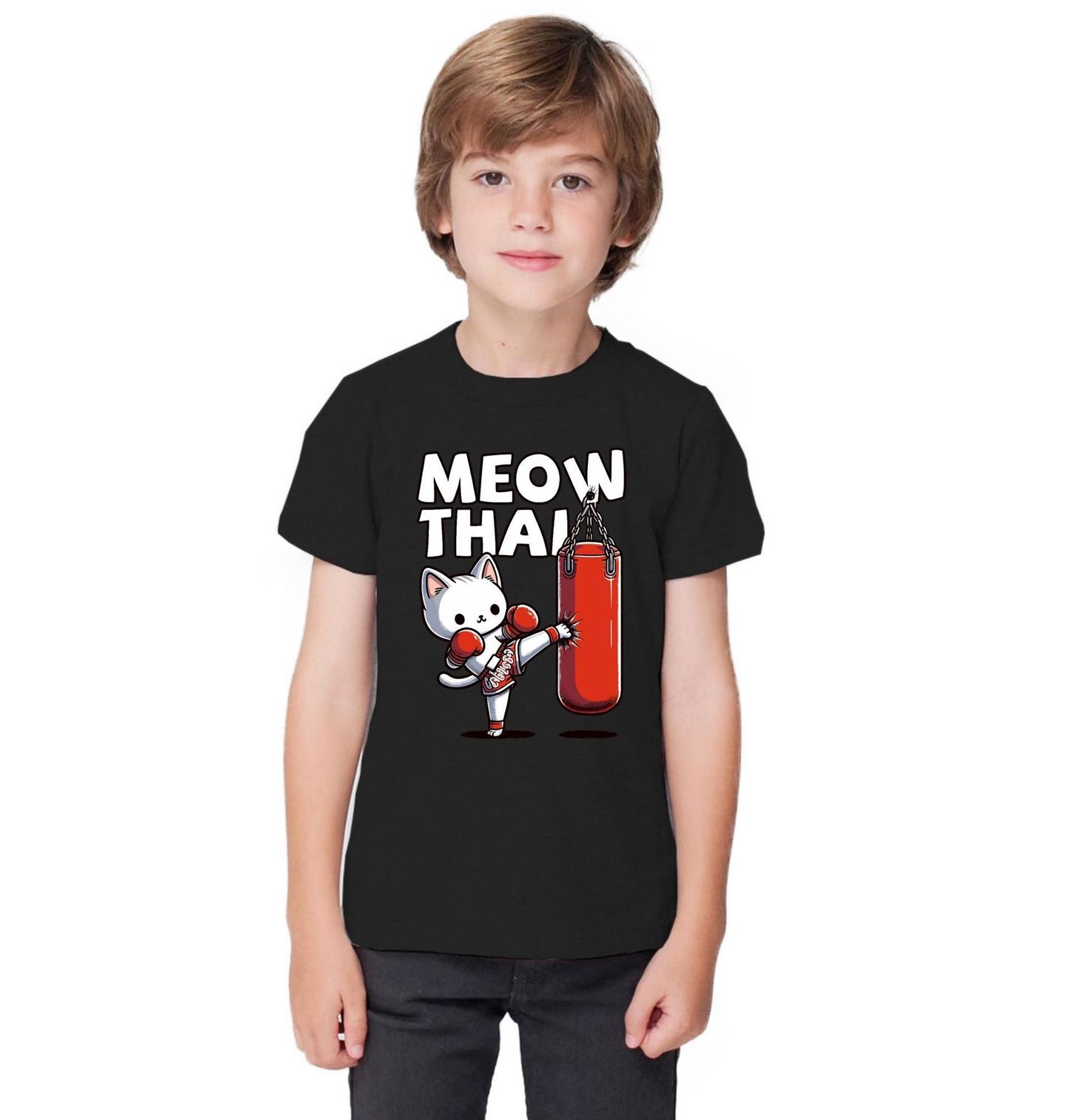 Dětské tričko Boxující Kočka Meow Thai. Originální a vtipný motiv, na kterém je kočka s boxerskými rukavicemi jak s plnou silou trénuje kop na boxovacím pytli. Nápis „Meow Thai“ si hravě pohrává s názvem thajského bojového umění Muay Thai, známého též jako thajský box. Perfektní dárek pro sportovce, trenéry, fanoušky thajského boxu i všechny, kteří milují humor a zvířata.