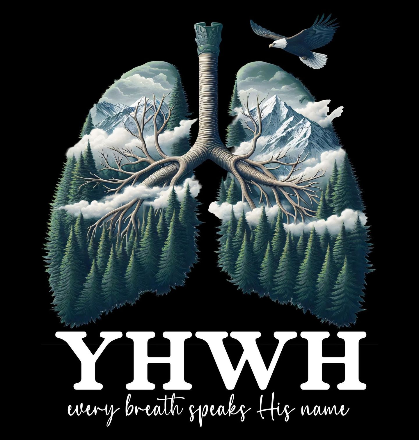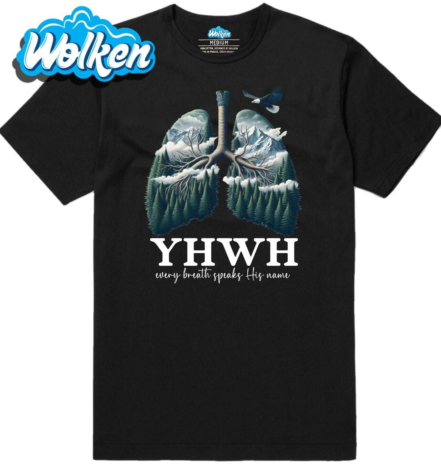 Pánské tričko Boží Plíce Every breath speaks His name. Tento hluboký náboženský motiv zobrazuje plíce vytvořené z přírody – lesů, hor a stromů – jako symbol Božího stvoření a dechu života. Uprostřed najdeme zkratku YHWH, starozákonní jméno Boha (Jahve), a nápis „každý dech vyslovuje Jeho jméno“, což připomíná, že každý náš dech je svědectvím Boží přítomnosti.