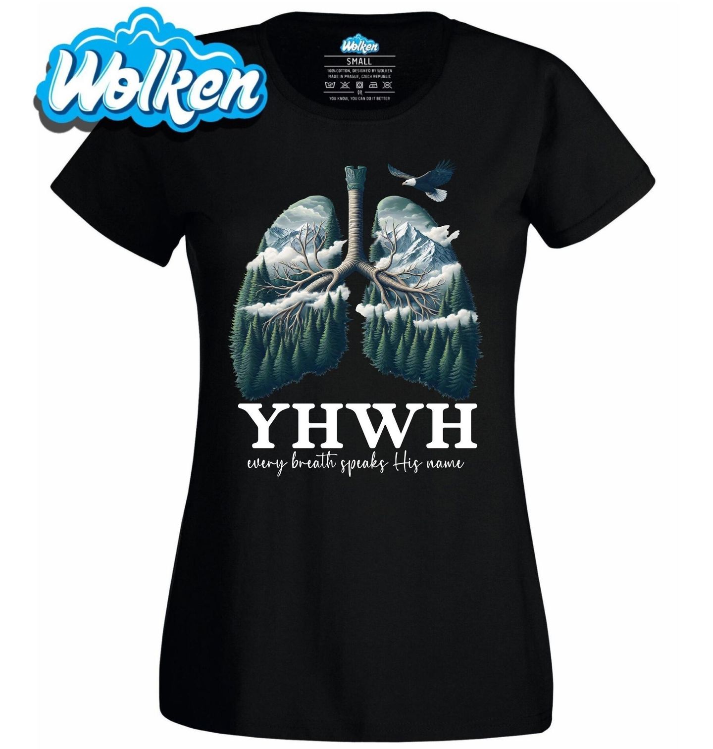 Dámské tričko Boží Plíce Every breath speaks His name. Tento hluboký náboženský motiv zobrazuje plíce vytvořené z přírody – lesů, hor a stromů – jako symbol Božího stvoření a dechu života. Uprostřed najdeme zkratku YHWH, starozákonní jméno Boha (Jahve), a nápis „každý dech vyslovuje Jeho jméno“, což připomíná, že každý náš dech je svědectvím Boží přítomnosti.