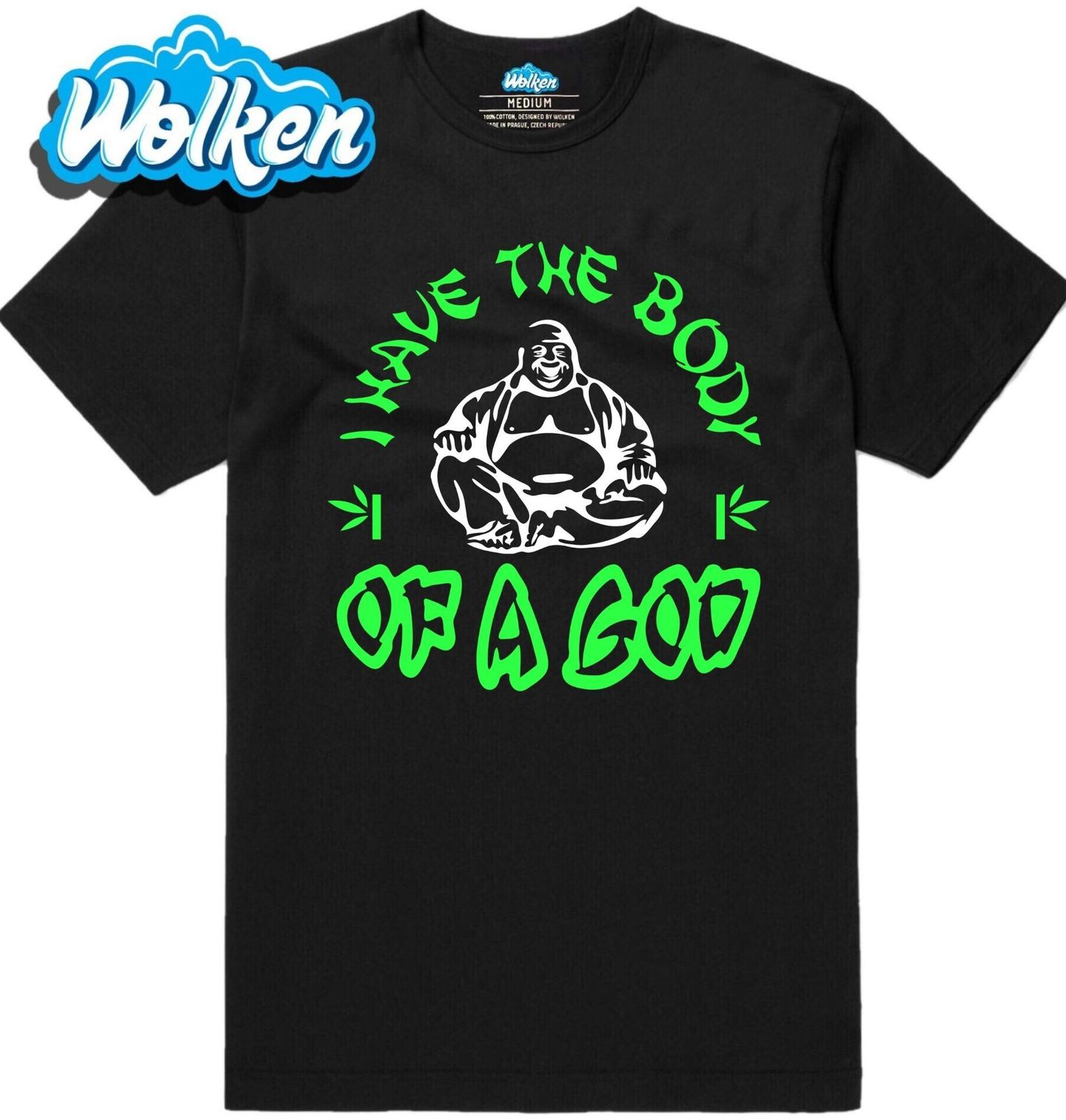 Pánské tričko Božská postava Buddhy. "I have the body of a god" = "Mám tělo boha". Pokud ti nevadí ukázat, že bůh nemusí mít nutně pekáč buchet, ale klidně pohodlný Budha styl, tenhle kousek je přesně pro tebe! Skvělý dárek pro kamaráda, který se rád zasměje sám sobě, nebo jako ironické přiznání vlastní filozofie pohodlí.
