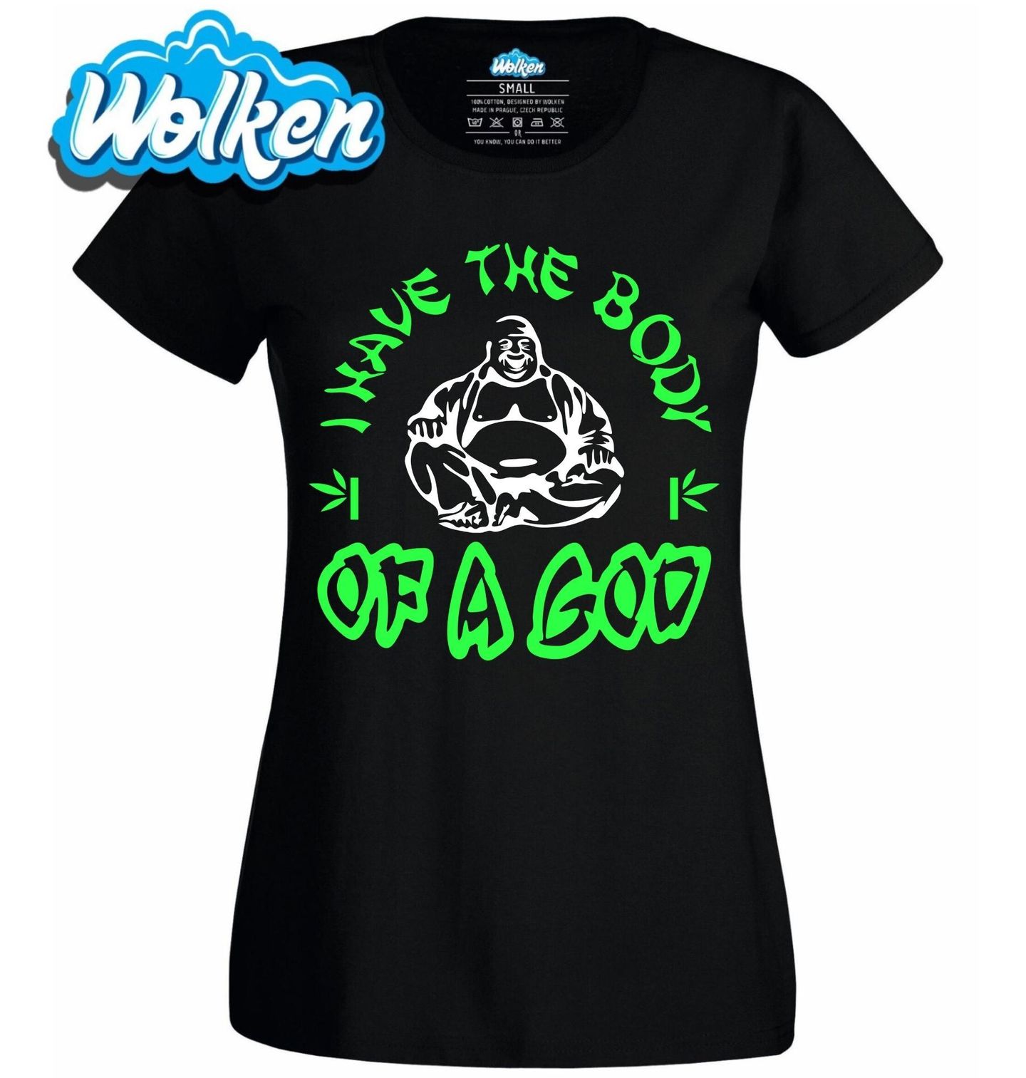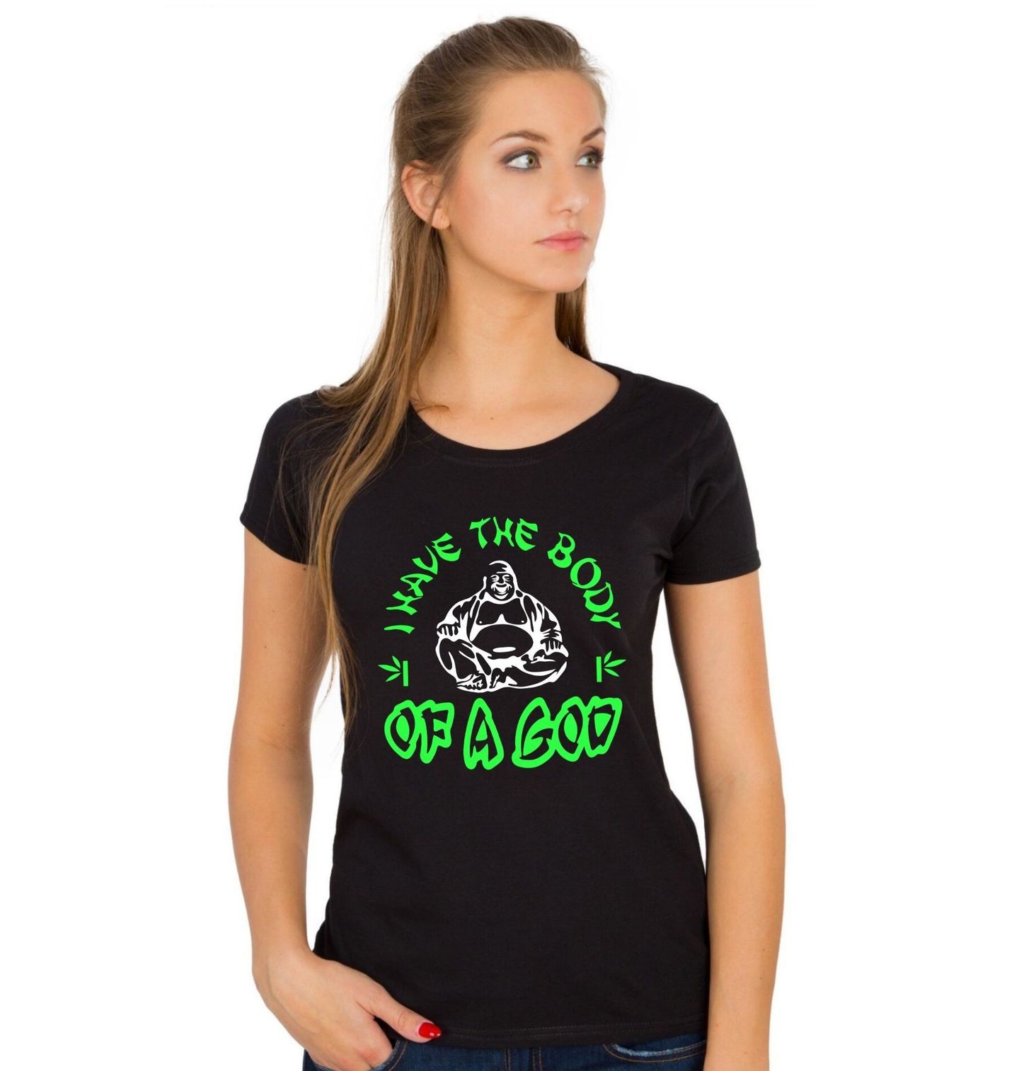 Dámské tričko Božská postava Buddhy. "I have the body of a god" = "Mám tělo boha". Pokud ti nevadí ukázat, že bůh nemusí mít nutně pekáč buchet, ale klidně pohodlný Budha styl, tenhle kousek je přesně pro tebe! Skvělý dárek pro kamaráda, který se rád zasměje sám sobě, nebo jako ironické přiznání vlastní filozofie pohodlí.