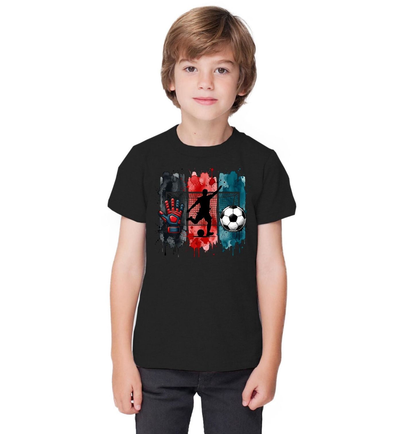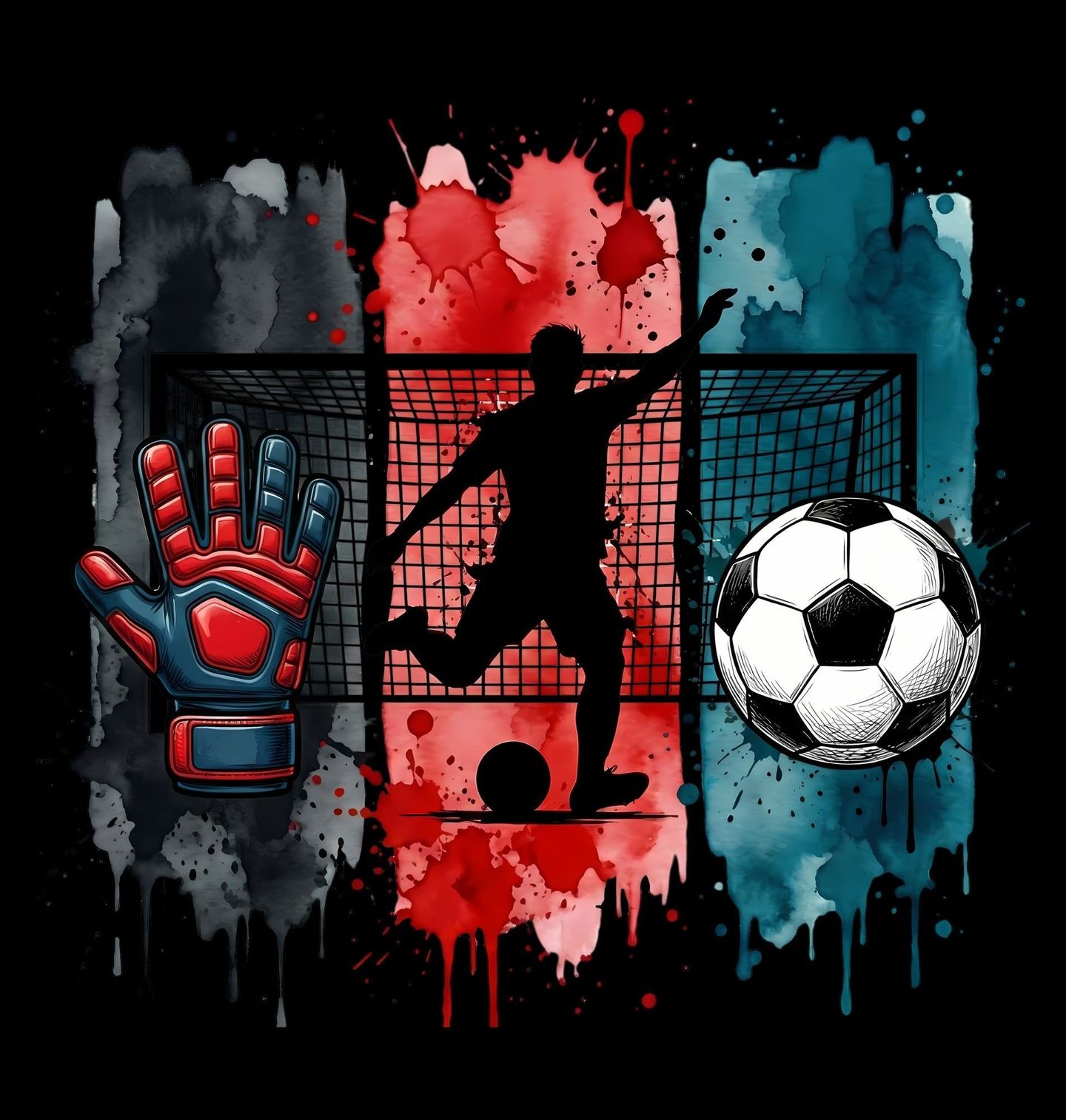 Dětské tričko Brankářské Rukavice. Dynamický motiv zachycuje napětí a emoce, které přináší fotbal jako jeden z nejpopulárnějších druhů sportu na světě. Silueta hráče před brankou, výrazná brankářská rukavice i míč vytvářejí silnou vizuální kompozici plnou energie a soustředění. Barevné kontrasty a moderní grafické zpracování dodávají designu jedinečný charakter, který ocení každý fanoušek.