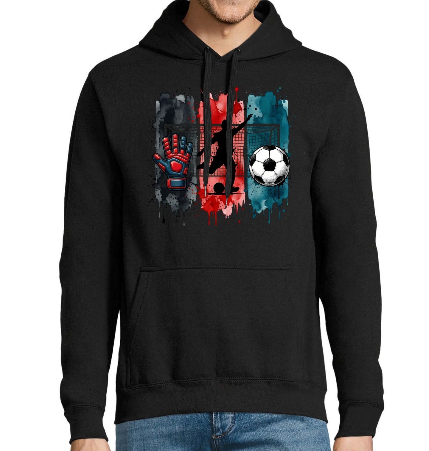 Pánská mikina Brankářské Rukavice. Dynamický motiv zachycuje napětí a emoce, které přináší fotbal jako jeden z nejpopulárnějších druhů sportu na světě. Silueta hráče před brankou, výrazná brankářská rukavice i míč vytvářejí silnou vizuální kompozici plnou energie a soustředění. Barevné kontrasty a moderní grafické zpracování dodávají designu jedinečný charakter, který ocení každý fanoušek.