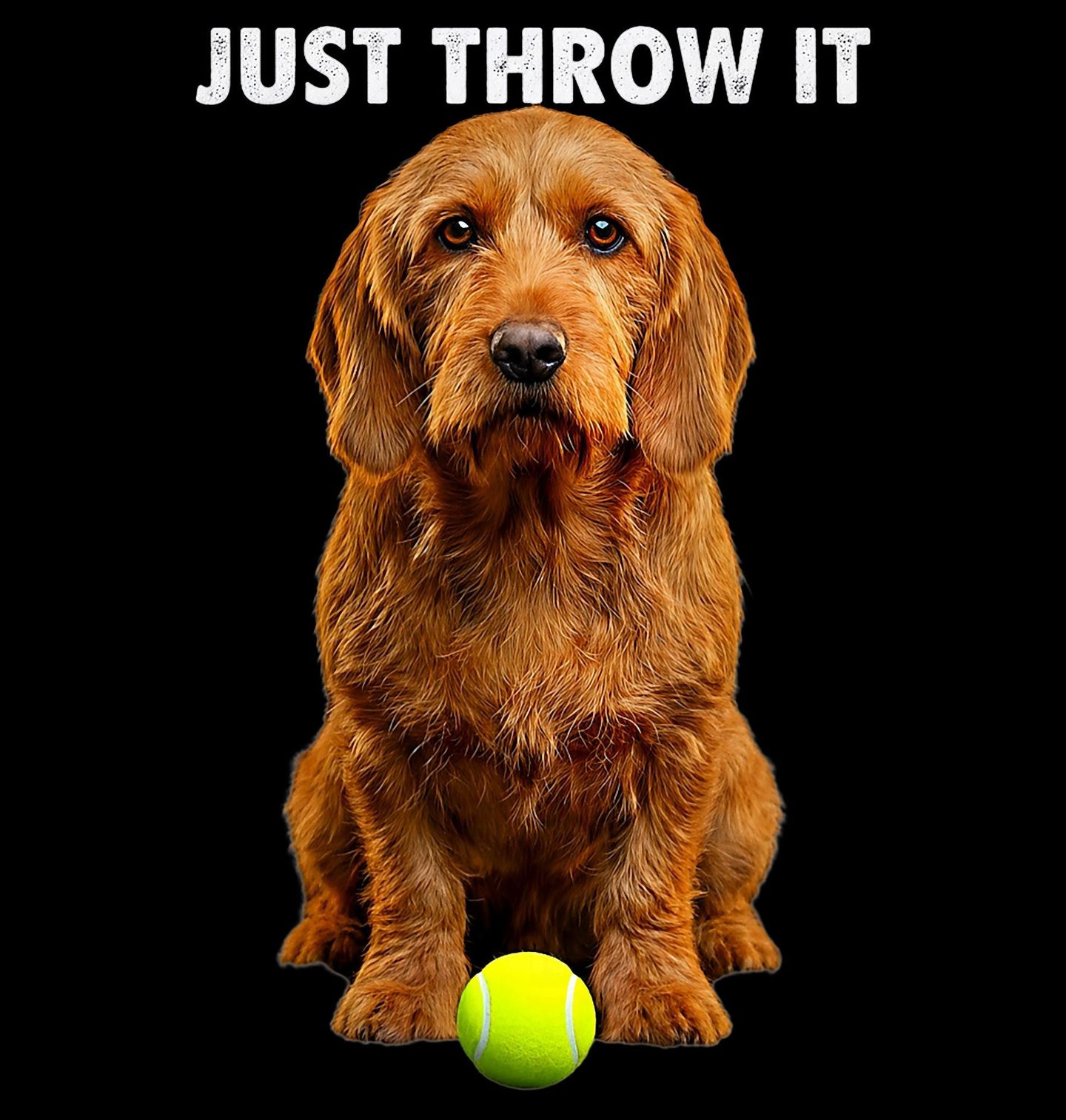 Dámské tričko Bretaňský baset Prostě to hoď. Roztomilý pes čekající na další hod s míčkem připomíná, jak jednoduchá může být radost ze hry. Text „JUST THROW IT“ znamená „Prostě to hoď“ a perfektně vystihuje nadšení a energii, kterou psi při aportování mají. Tento motiv je ideální pro všechny, kdo milují aktivní chvíle se svým čtyřnohým parťákem.