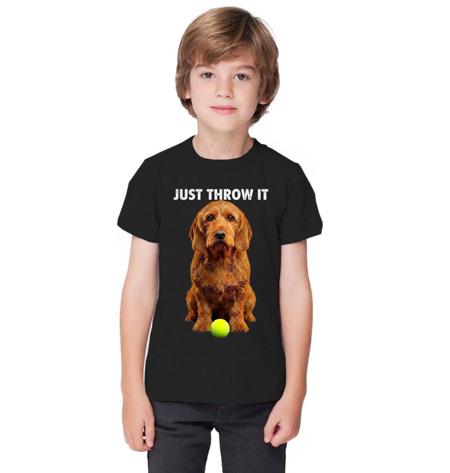 Dětské tričko Bretaňský baset Prostě to hoď. Roztomilý pes čekající na další hod s míčkem připomíná, jak jednoduchá může být radost ze hry. Text „JUST THROW IT“ znamená „Prostě to hoď“ a perfektně vystihuje nadšení a energii, kterou psi při aportování mají. Tento motiv je ideální pro všechny, kdo milují aktivní chvíle se svým čtyřnohým parťákem.