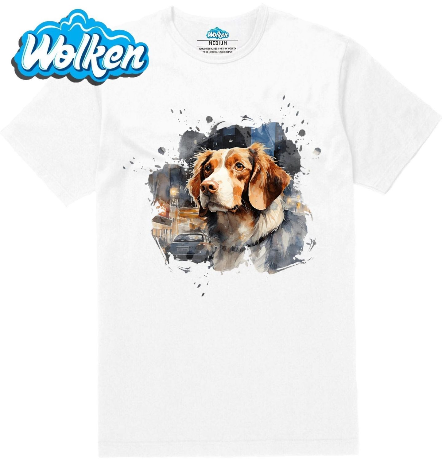 Pánské tričko Bretaňský ohař ve Městě. Spojení přírody, šlechtěného plemene a městské scenérie vytváří neotřelý design pro každého pejskaře, který žije naplno ve městě, ale srdcem zůstává v přírodě. Tento motiv je ideální pro každého milovníka psů, který chce světu ukázat, že pes má své místo i v moderním světě plném betonu a světel.