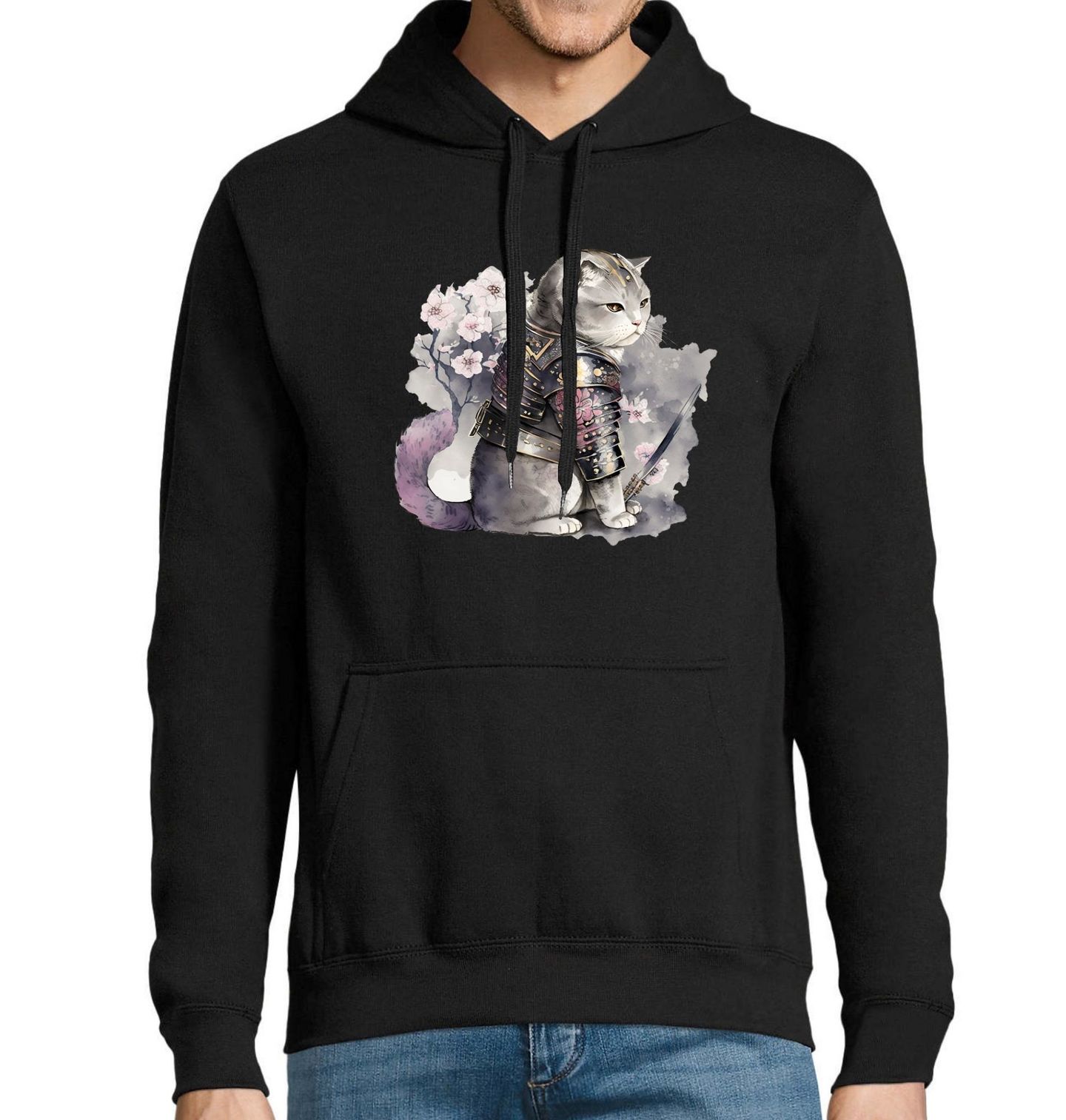 Pánská mikina Britská kočka Samuraj. Stylizovaná kočka ve zbroji samuraj sedí důstojně mezi květy sakury, připravená chránit čest a rovnováhu. Spojení elegance britské kočky, kultury Japonsko a odvahy samuraj tvoří silný, ale něžný motiv pro každého milovníka koček a estetiky Dálného východu.