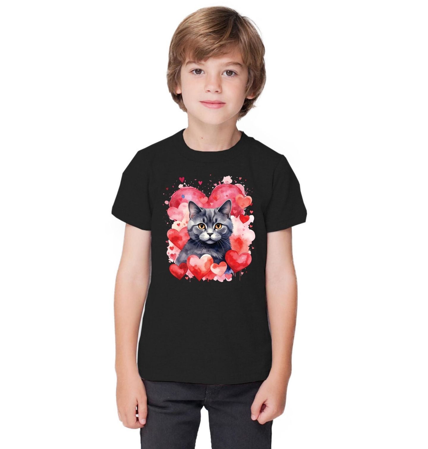 Dětské tričko Britská krátkosrstá Kočka mezi Srdci. Tento jemný a elegantní motiv zobrazuje kočka plemene britská krátkosrstá, typickou svou hustou šedou (modrou) srstí, kulatým obličejem a klidným, vyrovnaným výrazem. Britská krátkosrstá kočka je symbolem pohody, stability a tiché oddanosti, což se dokonale odráží v tomto romantickém akvarelovém zpracování.