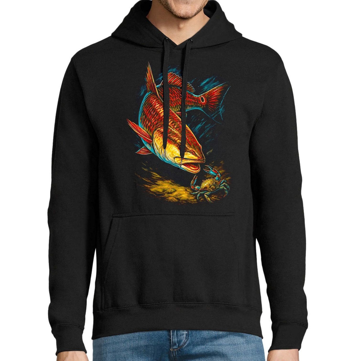 Pánská mikina Bubeník americký s Krabem. Tento výrazný motiv zachycuje Red Drum (Sciaenops ocellatus), jednoho z nejsilnějších a nejbojovnějších pobřežních predátorů. Dravý postoj, otevřená tlama a okamžik těsně před útokem vystihují syrovou energii, kterou zná každý, kdo bere rybaření jako vášeň, ne jen koníček.