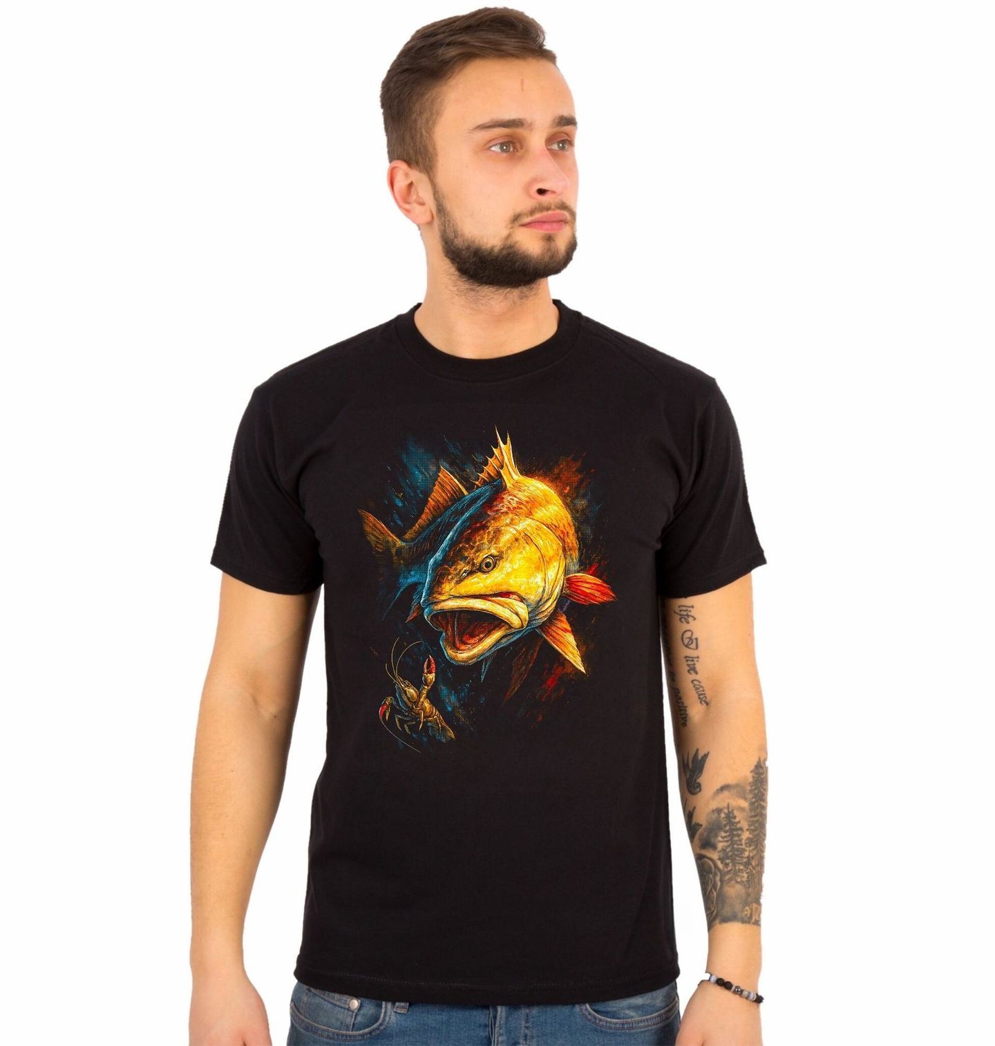 Pánské tričko Bubeník americký s Rakem. Motiv zachycuje dravce jménem Red Drum (Sciaenops ocellatus), známého také jako červený bubeník – silnou mořskou rybu proslulou prudkými výpady a bojem až do poslední chvíle. Na ilustraci je vyobrazen okamžik lovu, kdy Red Drum útočí na korýše, což je pro tento druh typické chování.