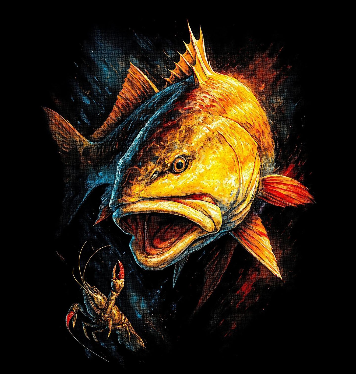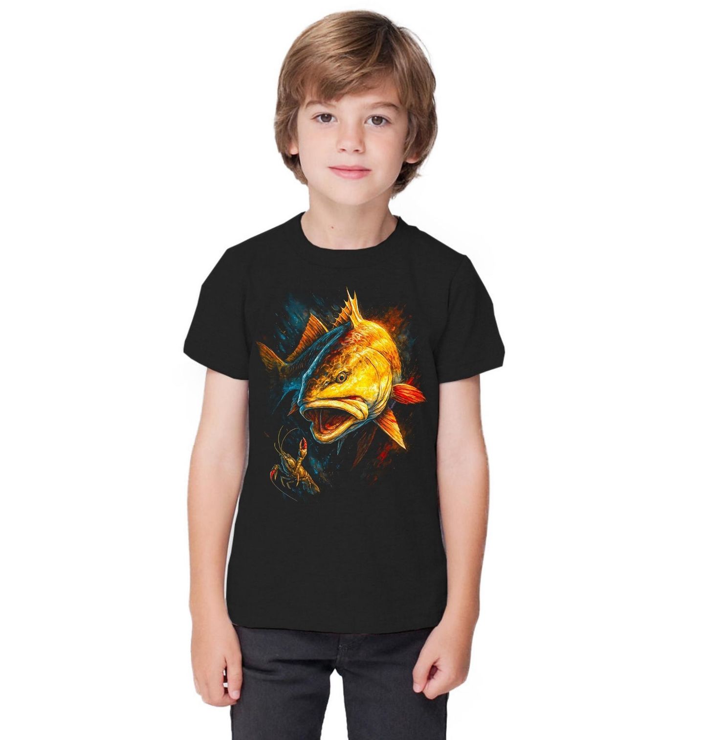 Dětské tričko Bubeník americký s Rakem. Motiv zachycuje dravce jménem Red Drum (Sciaenops ocellatus), známého také jako červený bubeník – silnou mořskou rybu proslulou prudkými výpady a bojem až do poslední chvíle. Na ilustraci je vyobrazen okamžik lovu, kdy Red Drum útočí na korýše, což je pro tento druh typické chování.