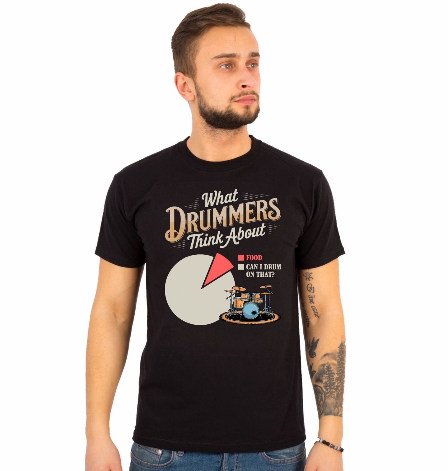 Pánské tričko Bubeník Myslí Jinak. Humorný design s koláčovým grafem ukazuje, na co myslí bubeník. Většinou na jídlo a na to, jestli se dá na něco bubnovat. Motiv s bicí soupravou a vtipným textem je ideální pro všechny milovníky rytmu, kapel a hudby. Bubeník je srdcem každé kapely a tento design to připomíná s nadsázkou.