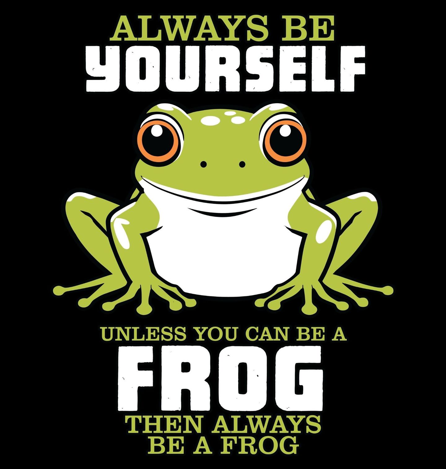 Dámské tričko Buď Sám Sebou Žába. Vtipný motiv se zelenou žábou a motivačním sloganem. Text na obrázku zní: “ALWAYS BE YOURSELF UNLESS YOU CAN BE A FROG THEN ALWAYS BE A FROG” (v překladu: „Vždy buď sám sebou, pokud nemůžeš být žába – pak buď vždy žába“). Ideální design pro milovníky humoru, zvířat a lehce absurdních životních pravd.