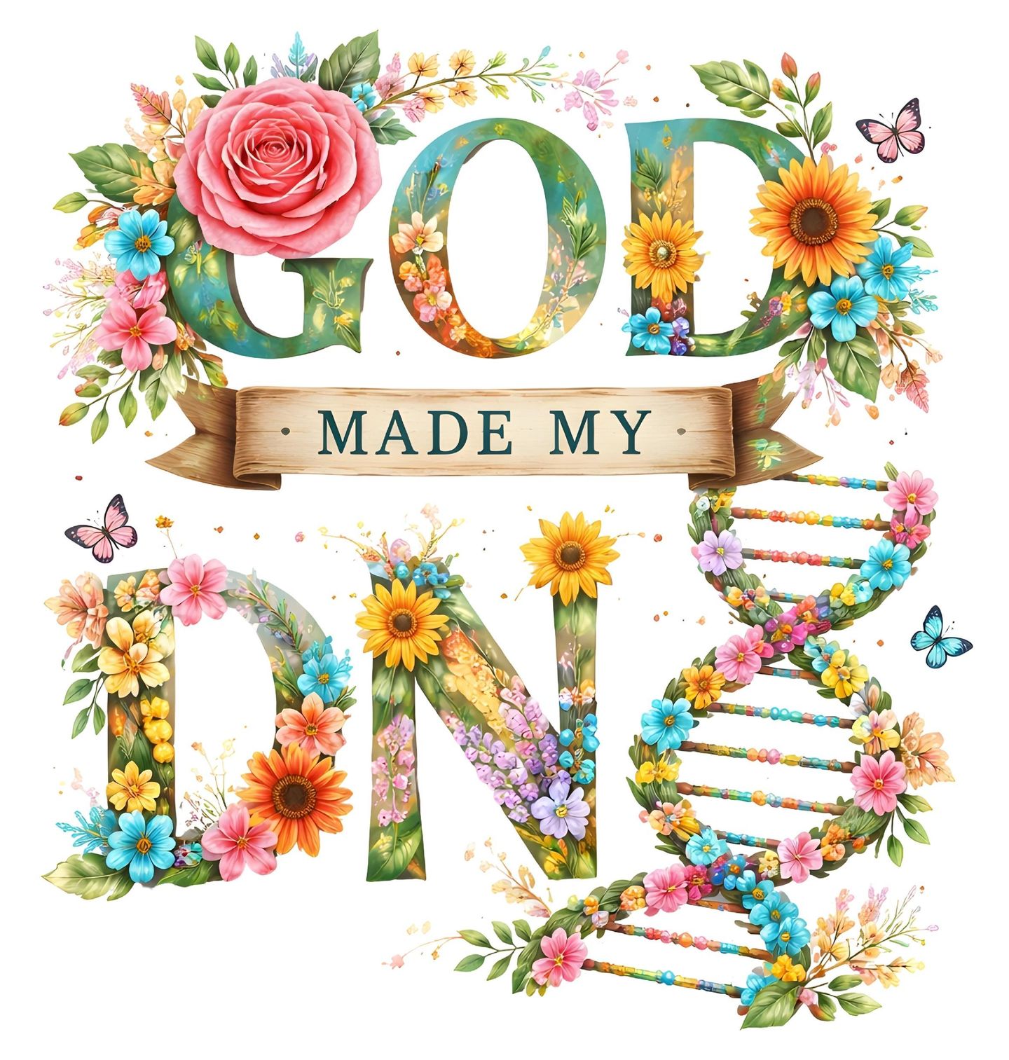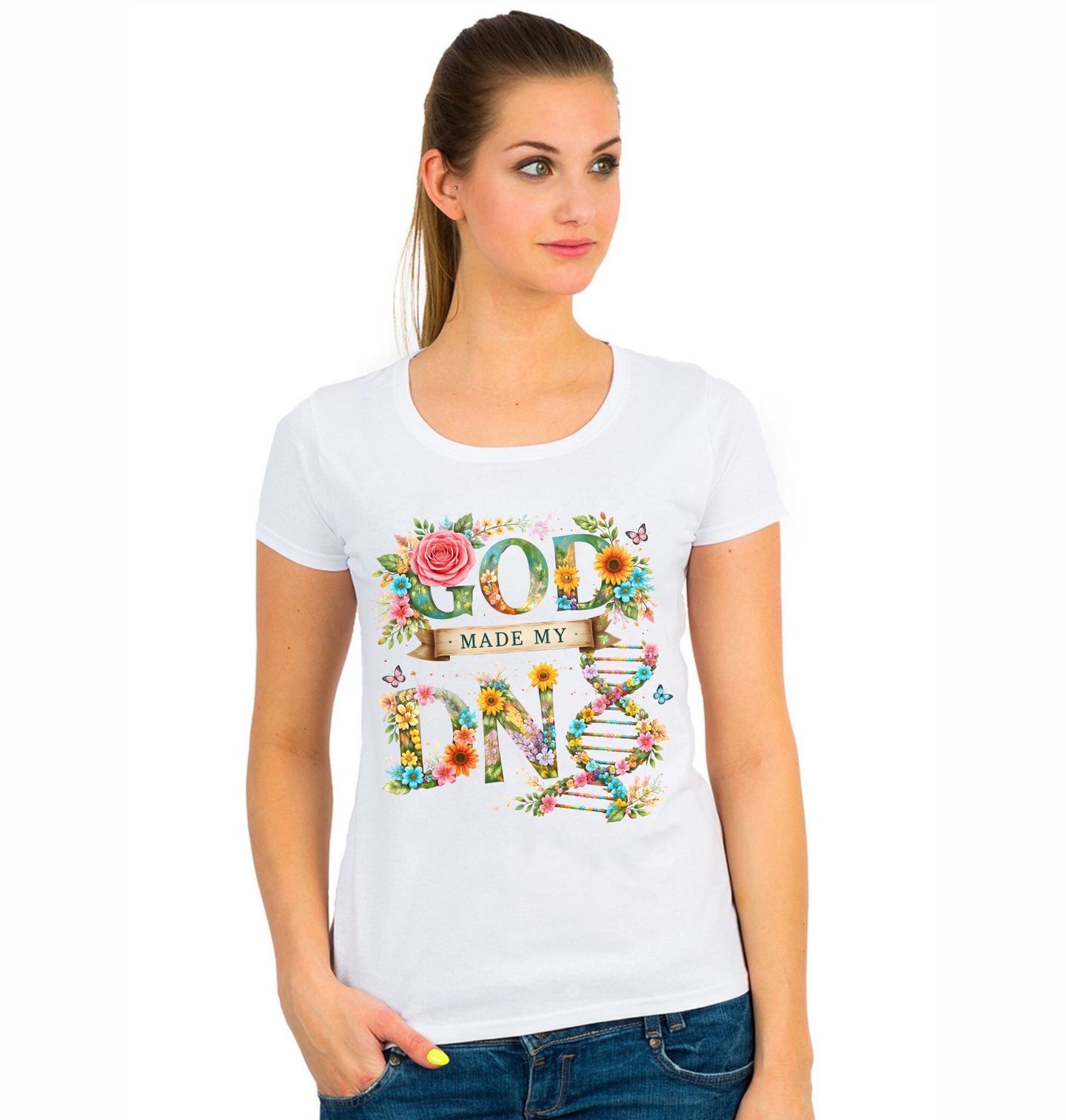 Dámské tričko Bůh mě Stvořil God Made my DNA. Barevný design s textem „GOD MADE MY DNA“ (Bůh stvořil mou DNA) propojuje motiv DNA a květin s duchovním poselstvím. Kombinace přírody a vědy vytváří unikátní vizuální styl. Ideální pro ty, kteří hledají motiv s tématem DNA, víra a příroda.