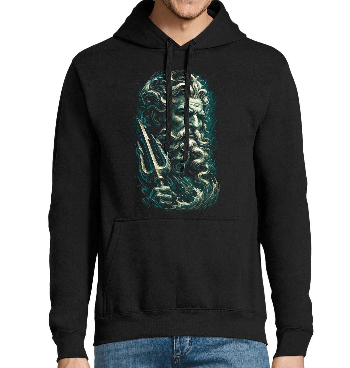 Pánská mikina Bůh Moří Poseidón. Poseidón je jeden z hlavních bohů řeckého panteonu, bratr Dia a Háda. Vládne mořím, zemětřesením i bouřím. Je symbolem síly přírody, nespoutané energie a respektu k vodnímu živlu. Jeho trojzubec představuje absolutní moc nad oceánem a schopnost ovlivňovat samotné síly světa. Vlny se kolem něj zvedají a připomínají jeho schopnost tvořit i ničit jediným pohybem.