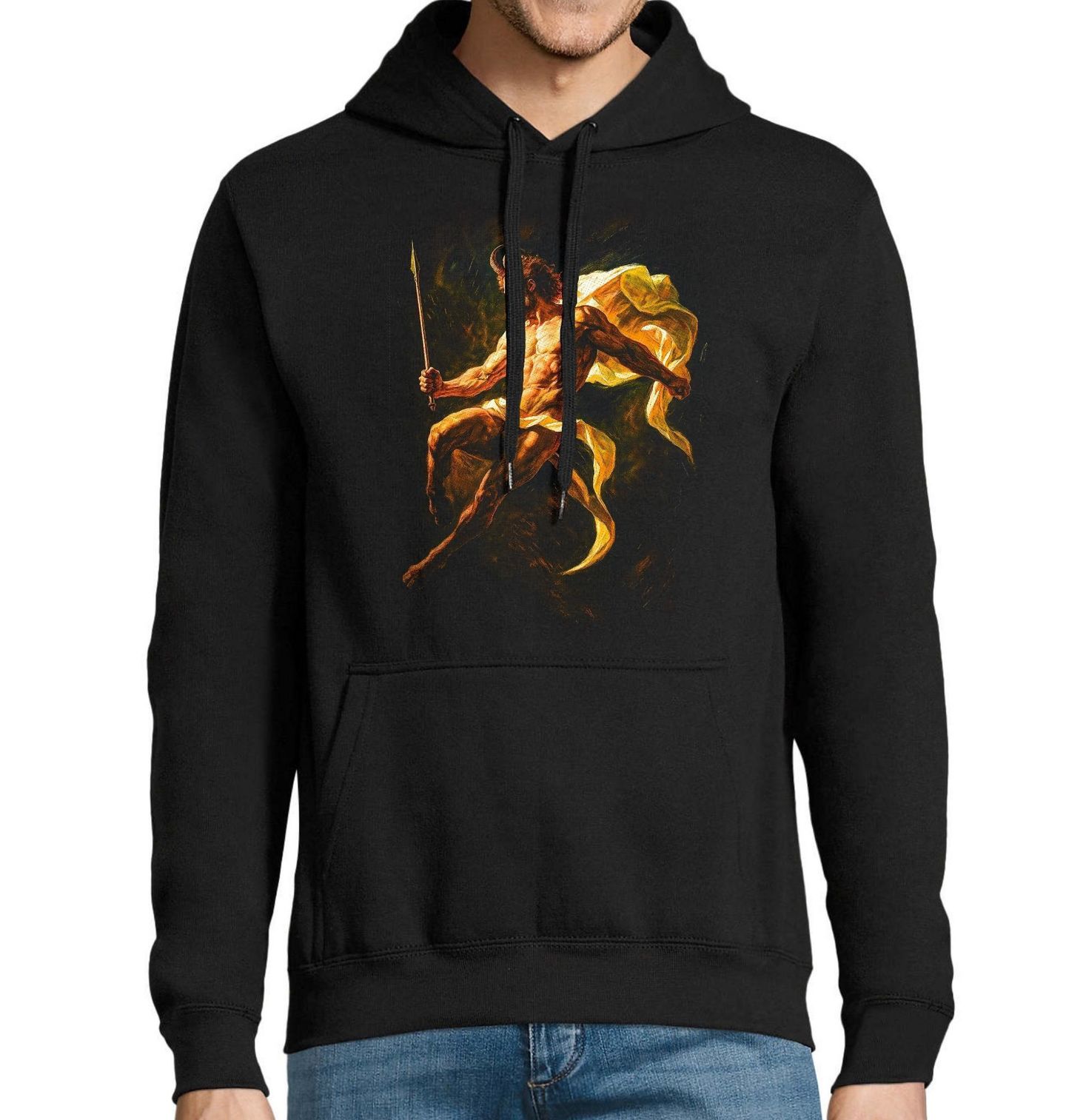 Pánská mikina Bůh Pan. Pan je řecký bůh lesů, pastvin, stád a také pastýřů a lovců, kteří ho uctívají. Má polozvířecí podobu, je porostlý srstí, má rohy, kozí kopýtka, bradu a ocas. Jeho jméno dalo vzniknout slovu „panika“, protože podle mýtů dokázal svým křikem vyvolat náhlý děs v srdcích lidí i nepřátel. Přesto nebyl zlý – byl symbolem svobody, pudovosti a přirozeného řádu přírody.