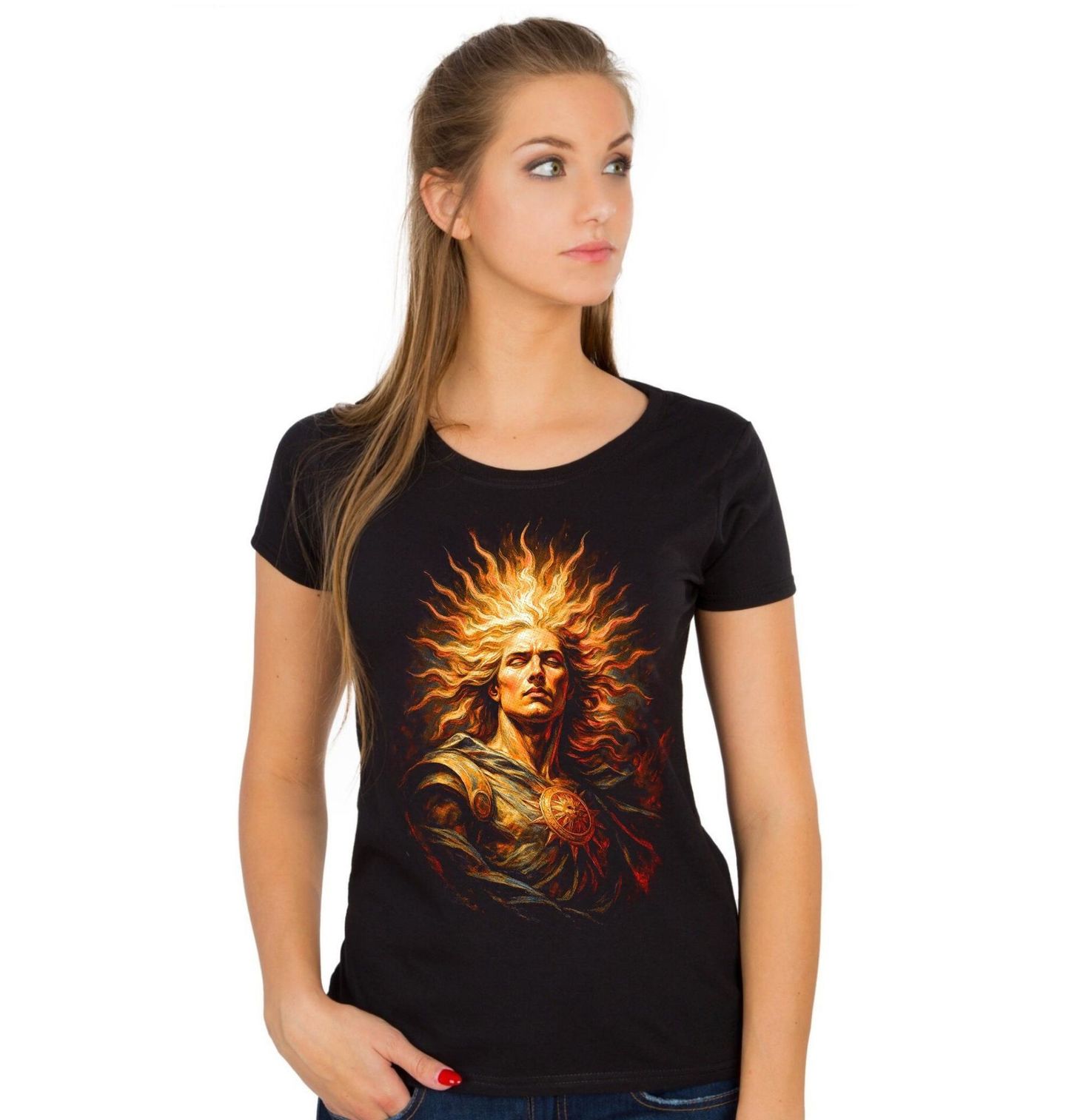 Dámské tričko Bůh Slunce Hélios. Helios byl titánem světla, který každý den projížděl oblohou ve svém ohnivém voze a přinášel den. Představoval bdělost, pravdu a neustálý koloběh času. V tomto moderním uměleckém zpracování působí majestátně, silně a nadčasově. Jeho zářivé vlasy připomínají plameny a paprsky, které osvětlují celý svět.
