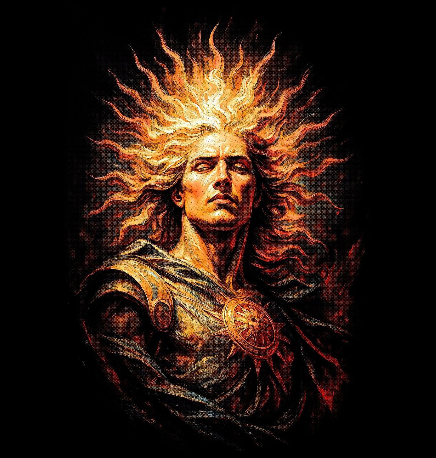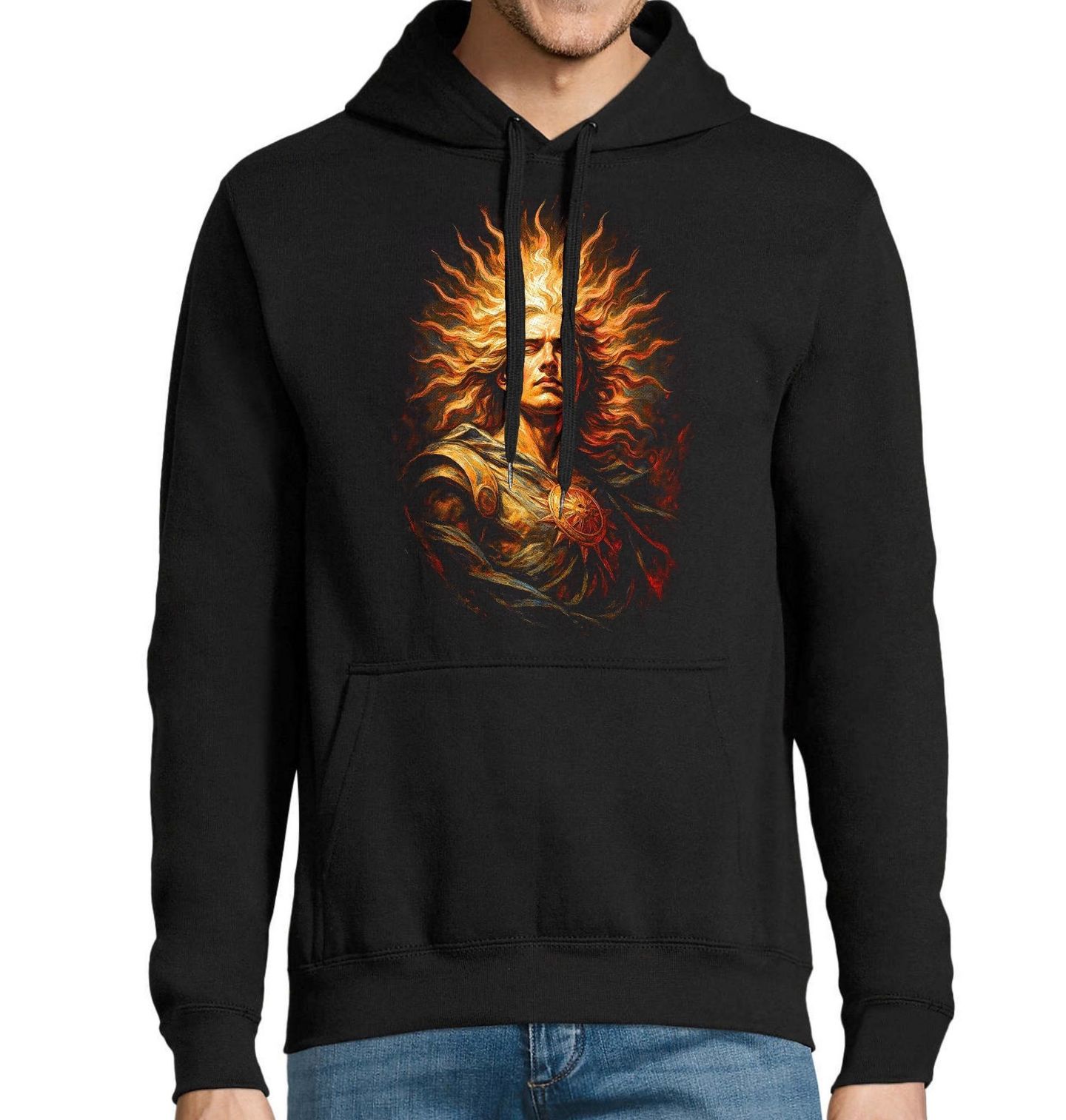 Pánská mikina Bůh Slunce Hélios. Helios byl titánem světla, který každý den projížděl oblohou ve svém ohnivém voze a přinášel den. Představoval bdělost, pravdu a neustálý koloběh času. V tomto moderním uměleckém zpracování působí majestátně, silně a nadčasově. Jeho zářivé vlasy připomínají plameny a paprsky, které osvětlují celý svět.