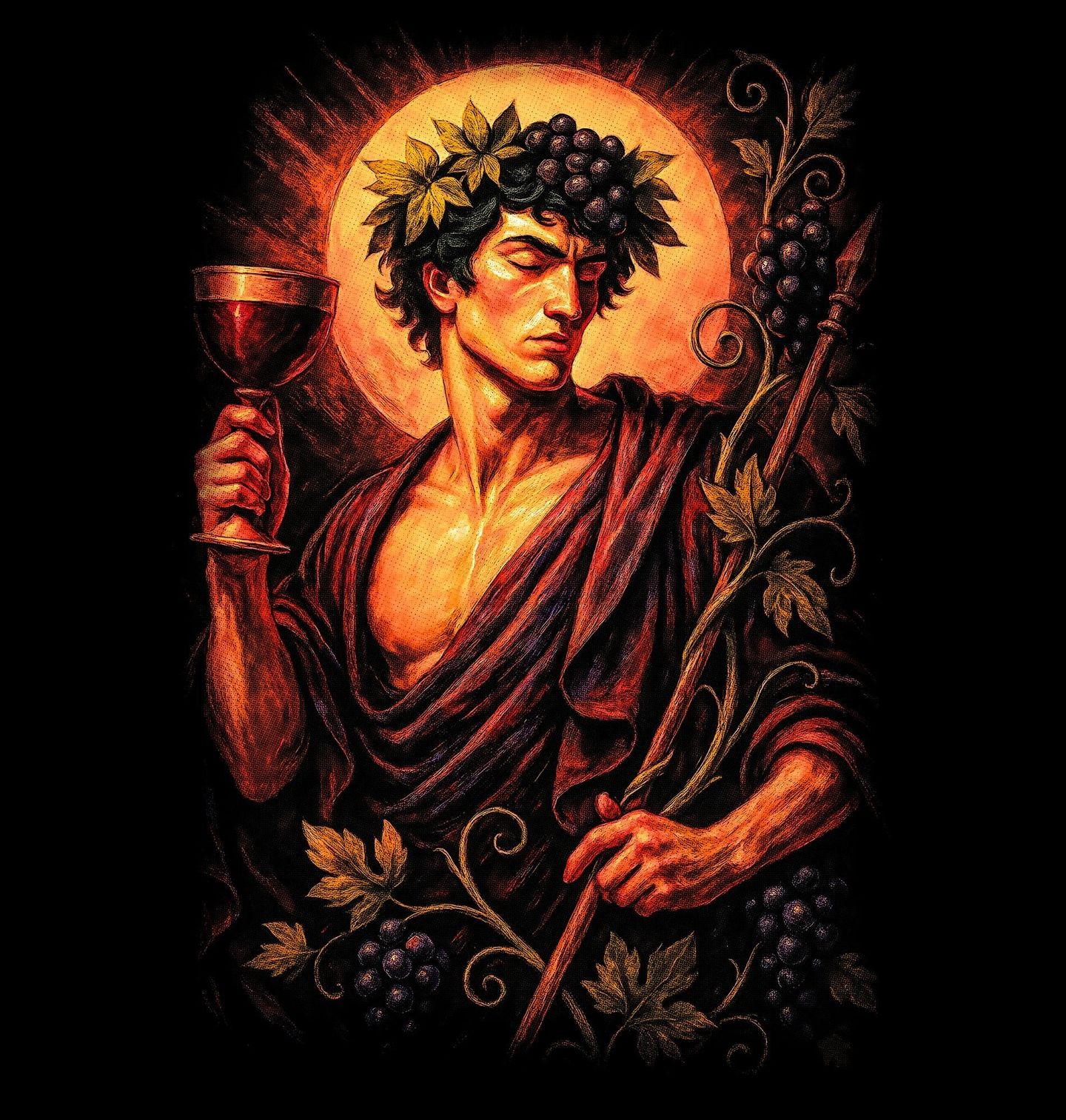 Pánské tričko Bůh Vína Dionýsos. Dionýsos nebyl jen bohem vína, ale také symbolem svobody, inspirace a hlubokých emocí. Řecká mytologie jej vykresluje jako božstvo, které boří hranice mezi řádem a vášní, mezi civilizací a divokostí. Vavřínový věnec, hrozny vína, číše a vinná réva jsou jeho typickými symboly. Dionýsos představuje sílu přírody, oslavu života i hranici mezi řádem a vášní.