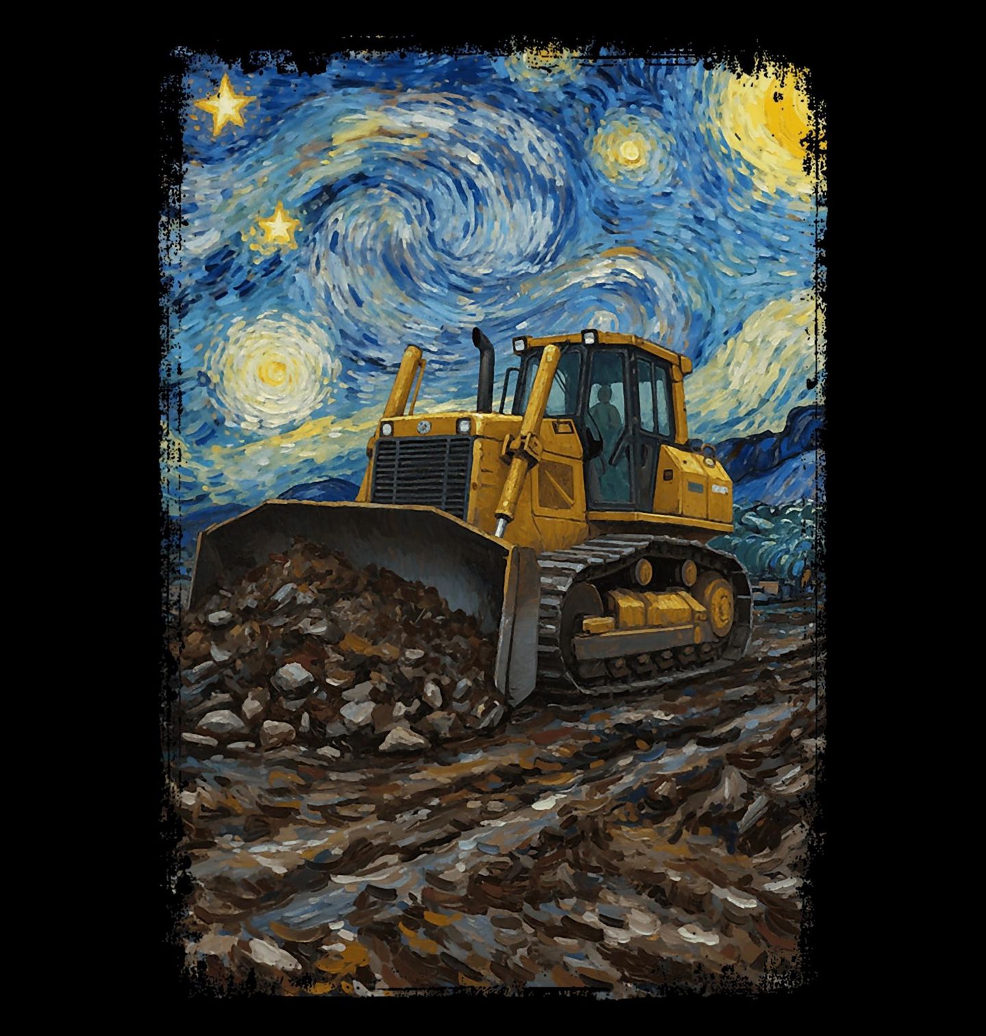 Dámské tričko Buldozer ve Hvězdné noci. Originální motiv spojuje slavný obraz Hvězdná noc od Vincenta van Gogha s mohutným stavebním strojem – buldozerem. Tento design je ideální pro milovníky techniky, umění i netradičních nápadů. Skvělé jako dárek pro fanoušky stavebních strojů, umění i kreativních motivů.