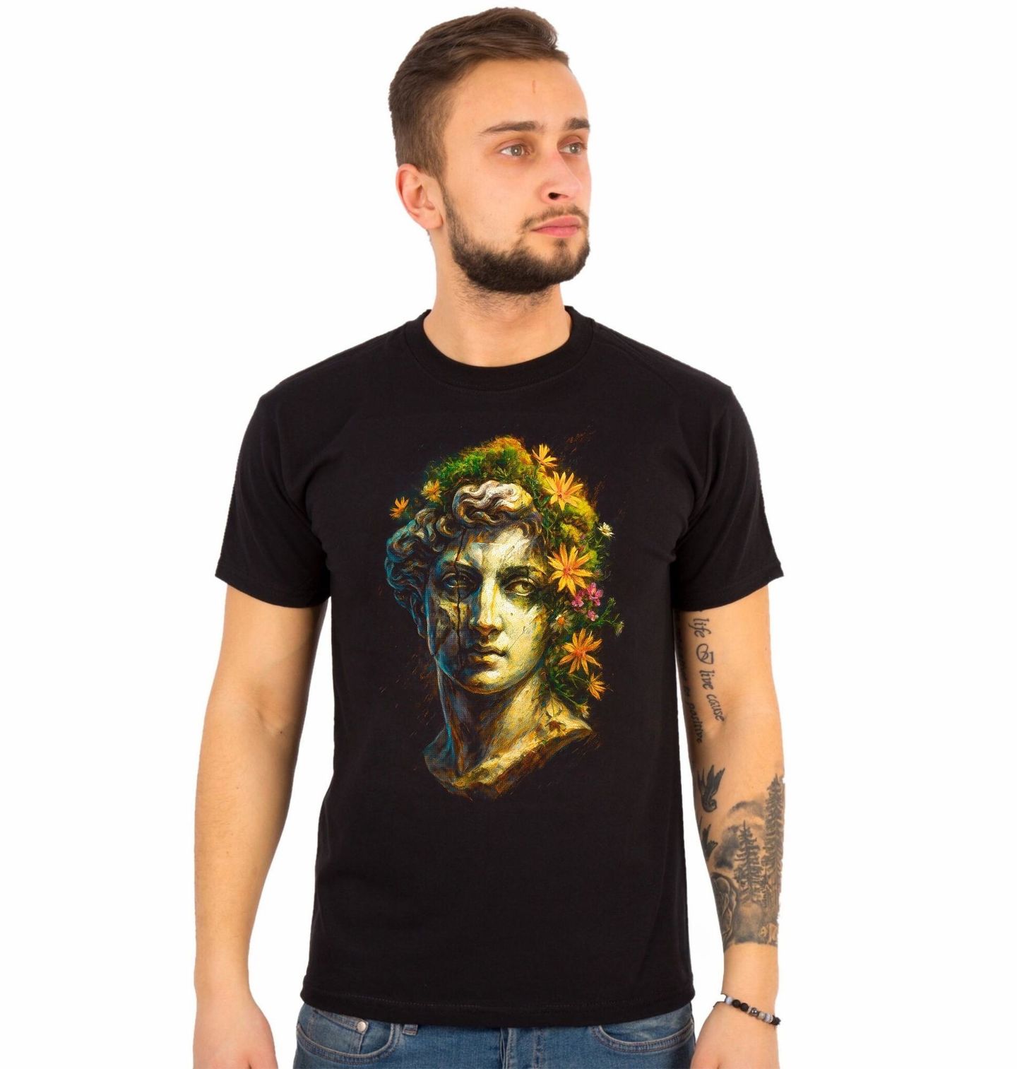 Pánské tričko Busta Apollóna. Tento umělecký motiv zachycuje Apollóna v podobě antické busty, propojené s přírodními prvky a květinami. Řecká mytologie jej představuje jako boha slunce, hudby, poezie a harmonie – symbol světla, rovnováhy a dokonalosti. Kombinace klasické sochařské estetiky a živých barevných akcentů vytváří jedinečný kontrast mezi kamenem a životem.