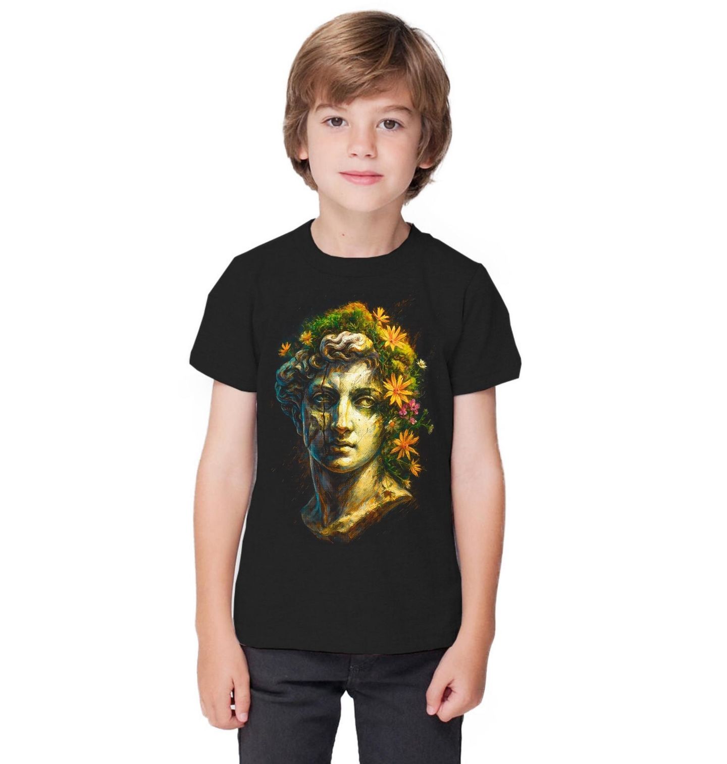 Dětské tričko Busta Apollóna. Tento umělecký motiv zachycuje Apollóna v podobě antické busty, propojené s přírodními prvky a květinami. Řecká mytologie jej představuje jako boha slunce, hudby, poezie a harmonie – symbol světla, rovnováhy a dokonalosti. Kombinace klasické sochařské estetiky a živých barevných akcentů vytváří jedinečný kontrast mezi kamenem a životem.