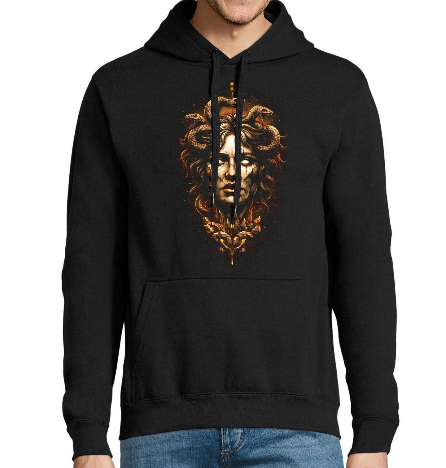 Pánská mikina Busta Medúzy. Temný a hypnotizující motiv zobrazuje mytickou bytost Medúza, jejíž vlasy tvoří živý had. Medúza je ikonická postava řecké mytologie, která dokáže svým pohledem proměnit každého v kámen. Detailní zpracování popraskané tváře a agresivních hadů dodává motivu silný, až démonický nádech. Tento had motiv je ideální pro všechny, kdo mají rádi temnou estetiku, mytologii a výrazný styl.