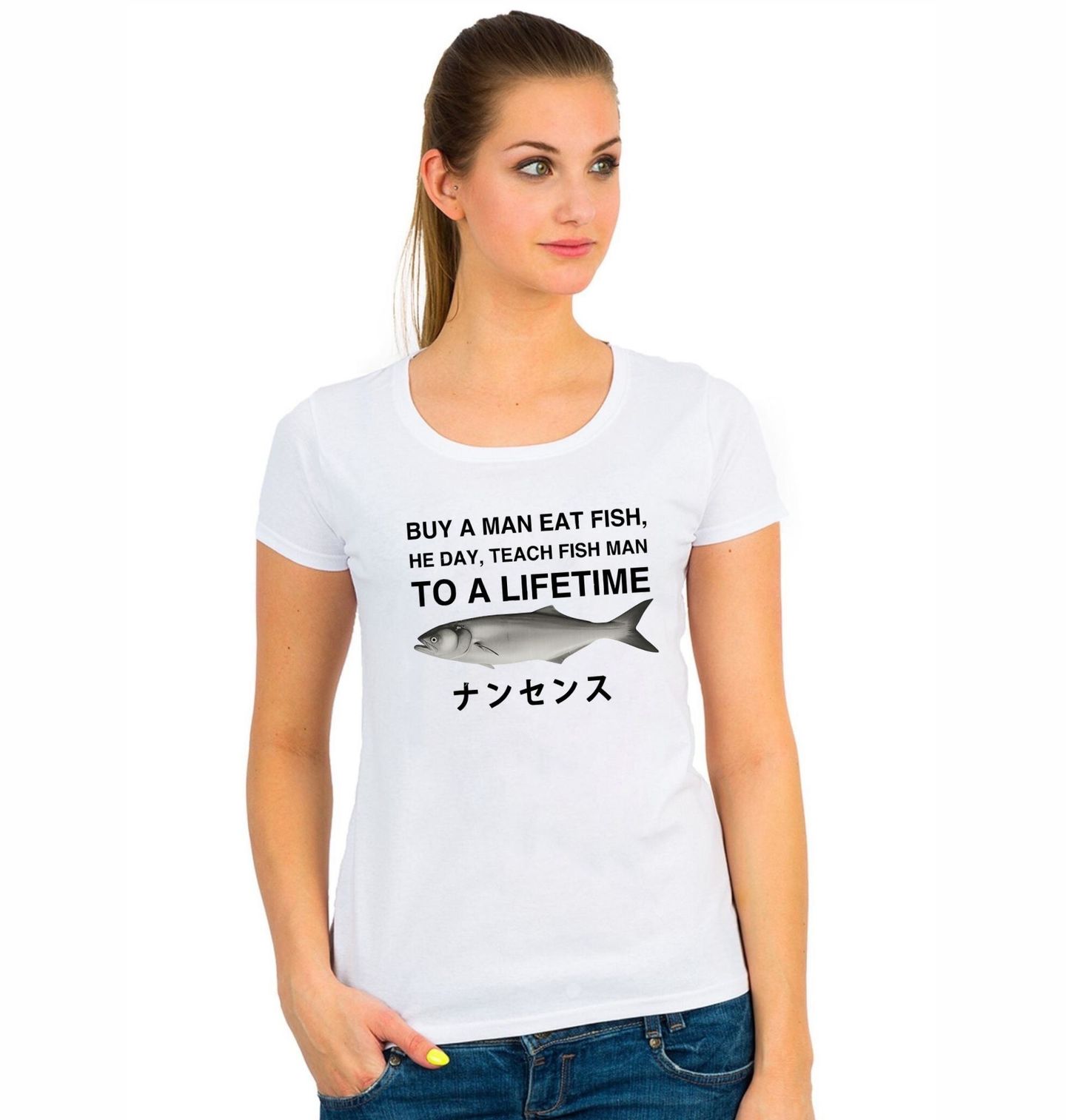 Dámské tričko Buy a man eat fish, he day, teach fish man to a lifetime. Hlavní roli tu hraje ryba, která doplňuje ikonickou parodii na známé přísloví: "Dej člověku rybu a nasytíš ho na den; nauč ho rybařit a nasytíš ho na celý život". A japonský text dole: ナンセンス znamená „nesmysl“. Motiv je skvělý jako dárek pro fanoušky meme kultury.