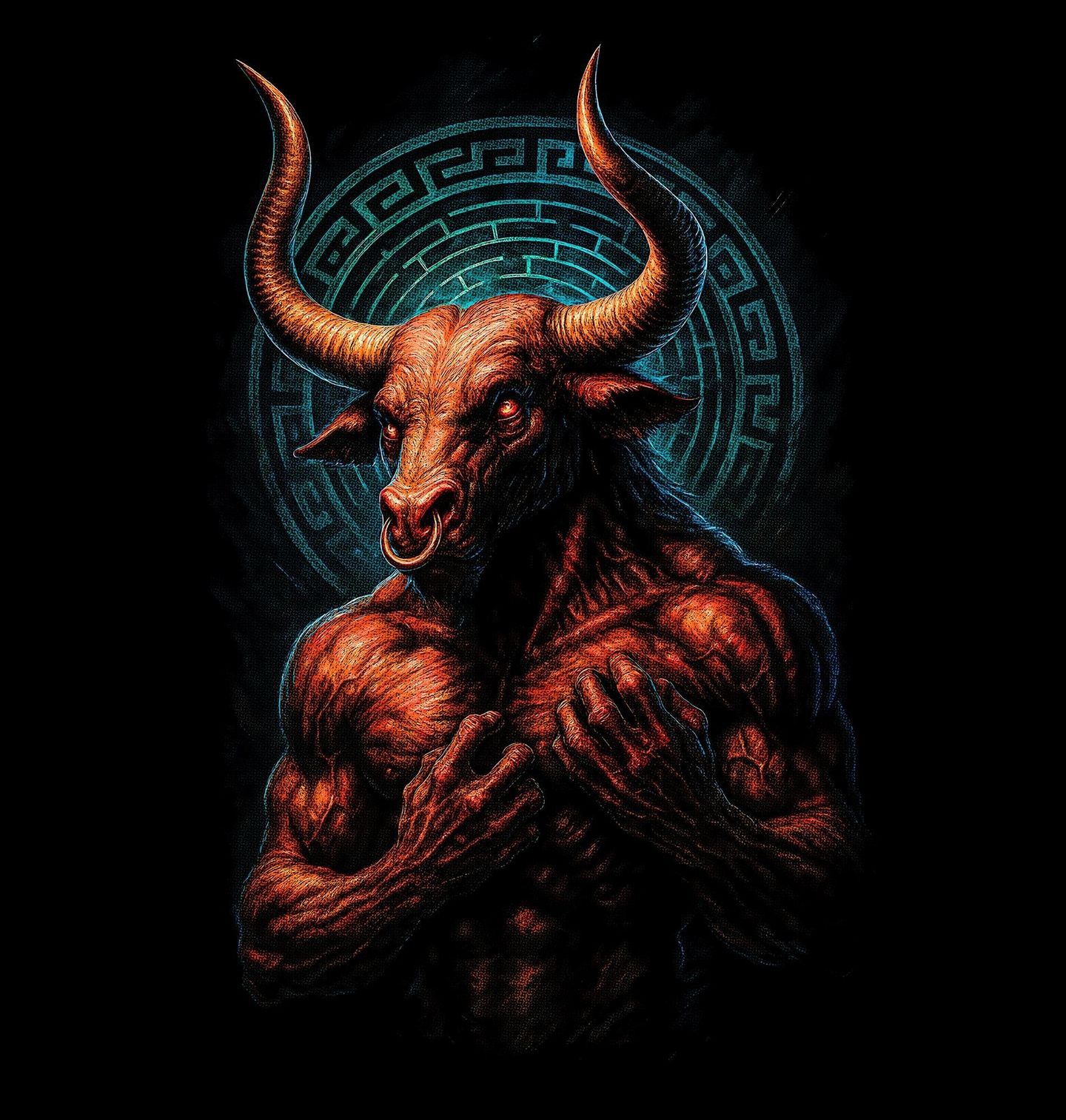 Dětské tričko Býk Minotaurus Bestie Labyrintu. Na obrázku je vyobrazen Minotaurus, jedna z nejslavnějších a nejděsivějších nestvůr ve starověké řecké mytologii. Silná muskulatura, pronikavý pohled a majestátní rohy symbolizují nespoutanou sílu, divokost i tragický osud tvora uvězněného v krétském labyrintu. Král Mínós jej nechal uvěznit v Labyrintu, který postavil Daidalos.
