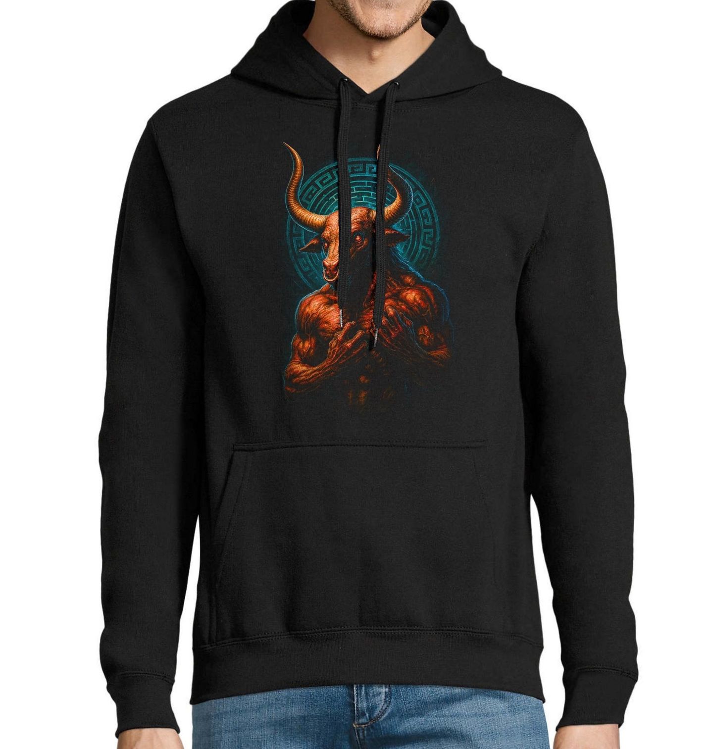 Pánská mikina Býk Minotaurus Bestie Labyrintu. Na obrázku je vyobrazen Minotaurus, jedna z nejslavnějších a nejděsivějších nestvůr ve starověké řecké mytologii. Silná muskulatura, pronikavý pohled a majestátní rohy symbolizují nespoutanou sílu, divokost i tragický osud tvora uvězněného v krétském labyrintu. Král Mínós jej nechal uvěznit v Labyrintu, který postavil Daidalos.