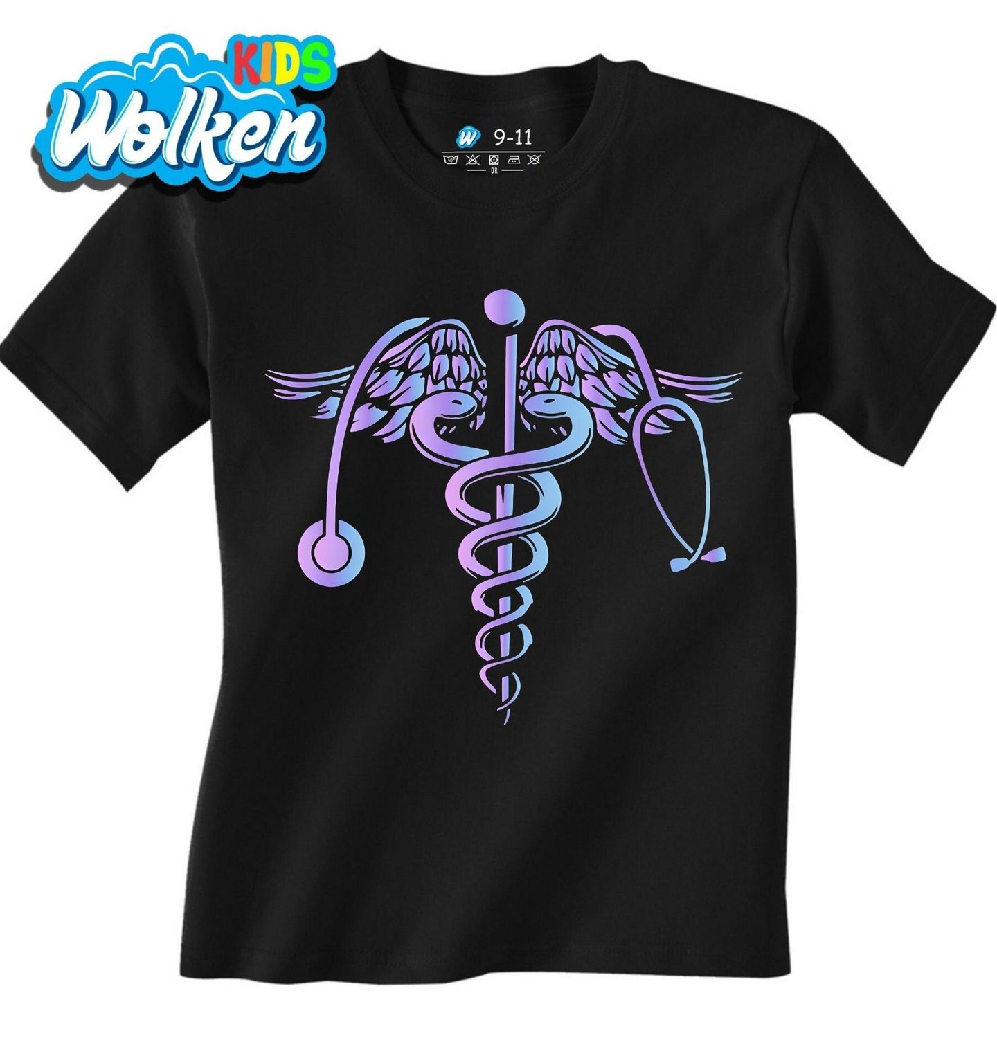 Dětské tričko Caduceus Anděl zdravotnictví. Kaduceus – symbol tradičně spojovaný s lékařstvím a zdravotnictvím. Je zde vyobrazen hůl obtočená dvěma hady, s křídly a stetoskopem, což moderně vyjadřuje respekt, odbornost a lidskost, kterou každý pracovník ve zdravotnictví přináší. Ideální design pro zdravotníky a doktory.