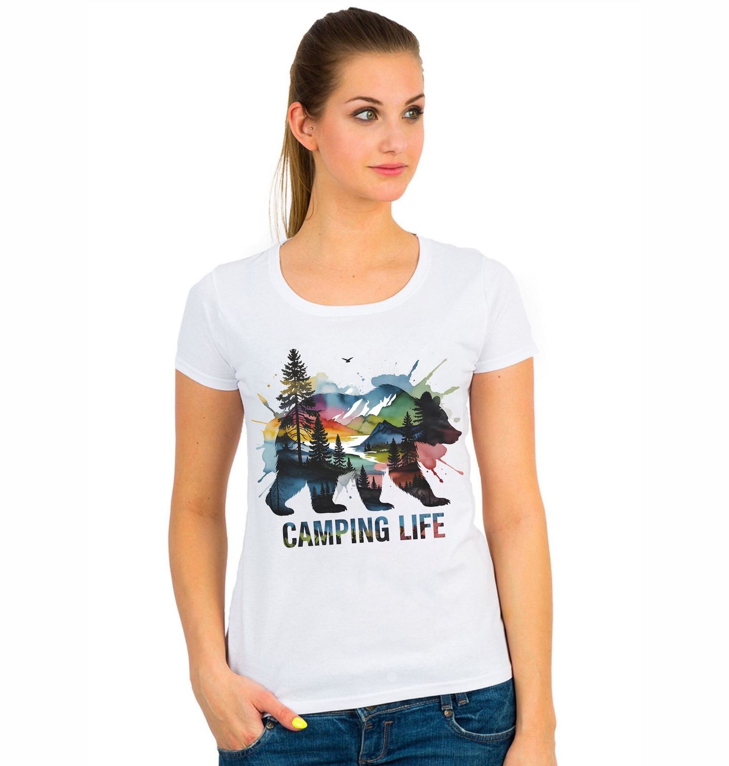 Dámské tričko Camping Life Barevný Medvěd. Barevný umělecký motiv medvěda, jehož tělo tvoří krajina s horami, lesy a vodou. Design doplňuje nápis „CAMPING LIFE“ (Kempovací život), který vyjadřuje lásku k přírodě, dobrodružství a pobytu venku. Tento motiv je vhodný pro kempaře, cestovatele a všechny, kdo milují spaní pod širákem.