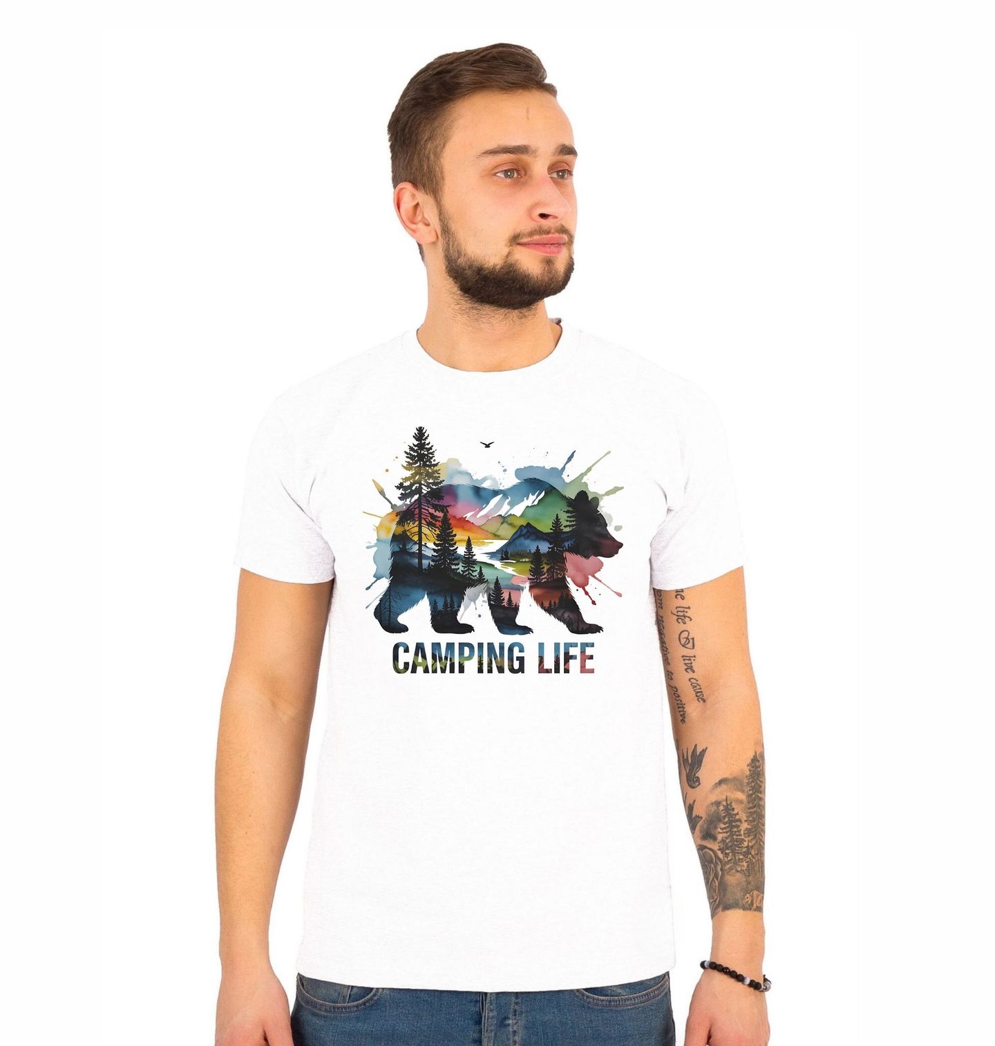 Pánské tričko Camping Life Barevný Medvěd. Barevný umělecký motiv medvěda, jehož tělo tvoří krajina s horami, lesy a vodou. Design doplňuje nápis „CAMPING LIFE“ (Kempovací život), který vyjadřuje lásku k přírodě, dobrodružství a pobytu venku. Tento motiv je vhodný pro kempaře, cestovatele a všechny, kdo milují spaní pod širákem.