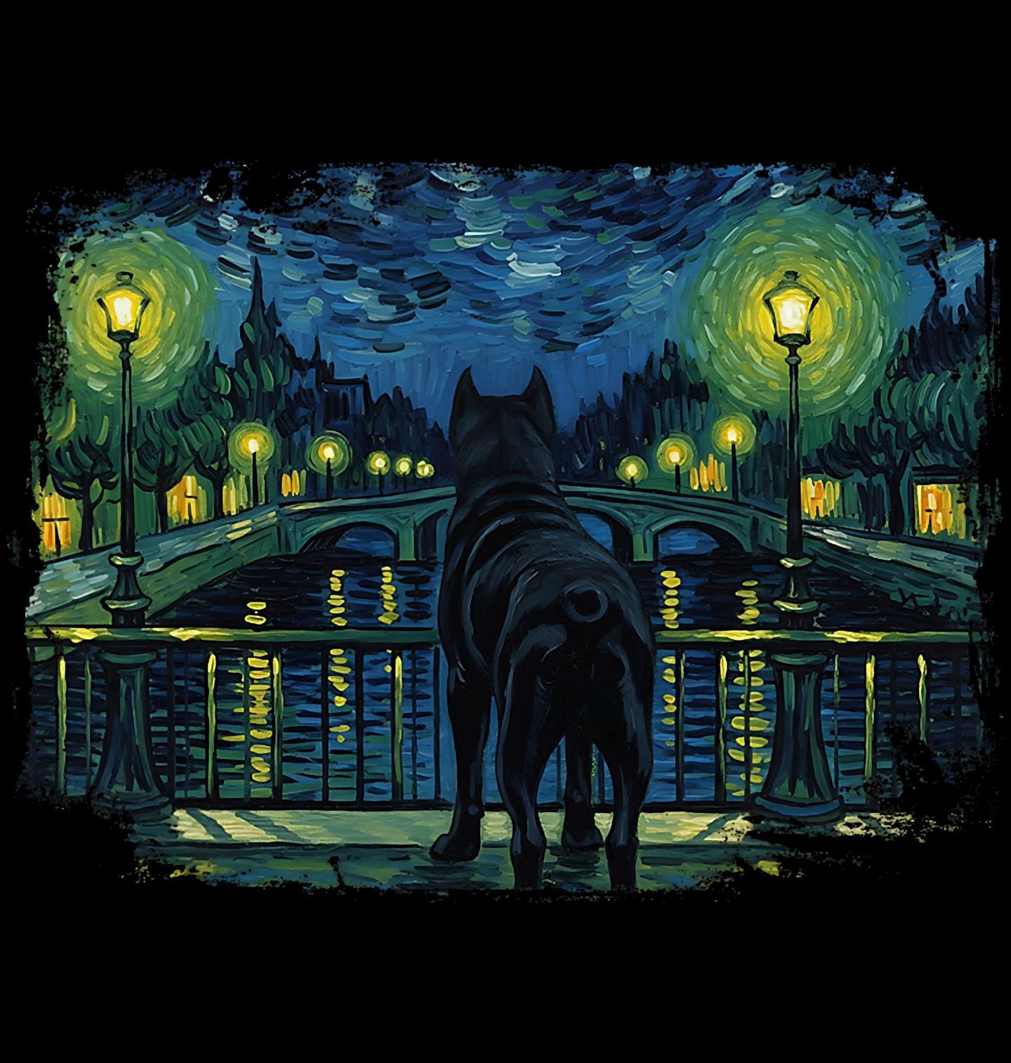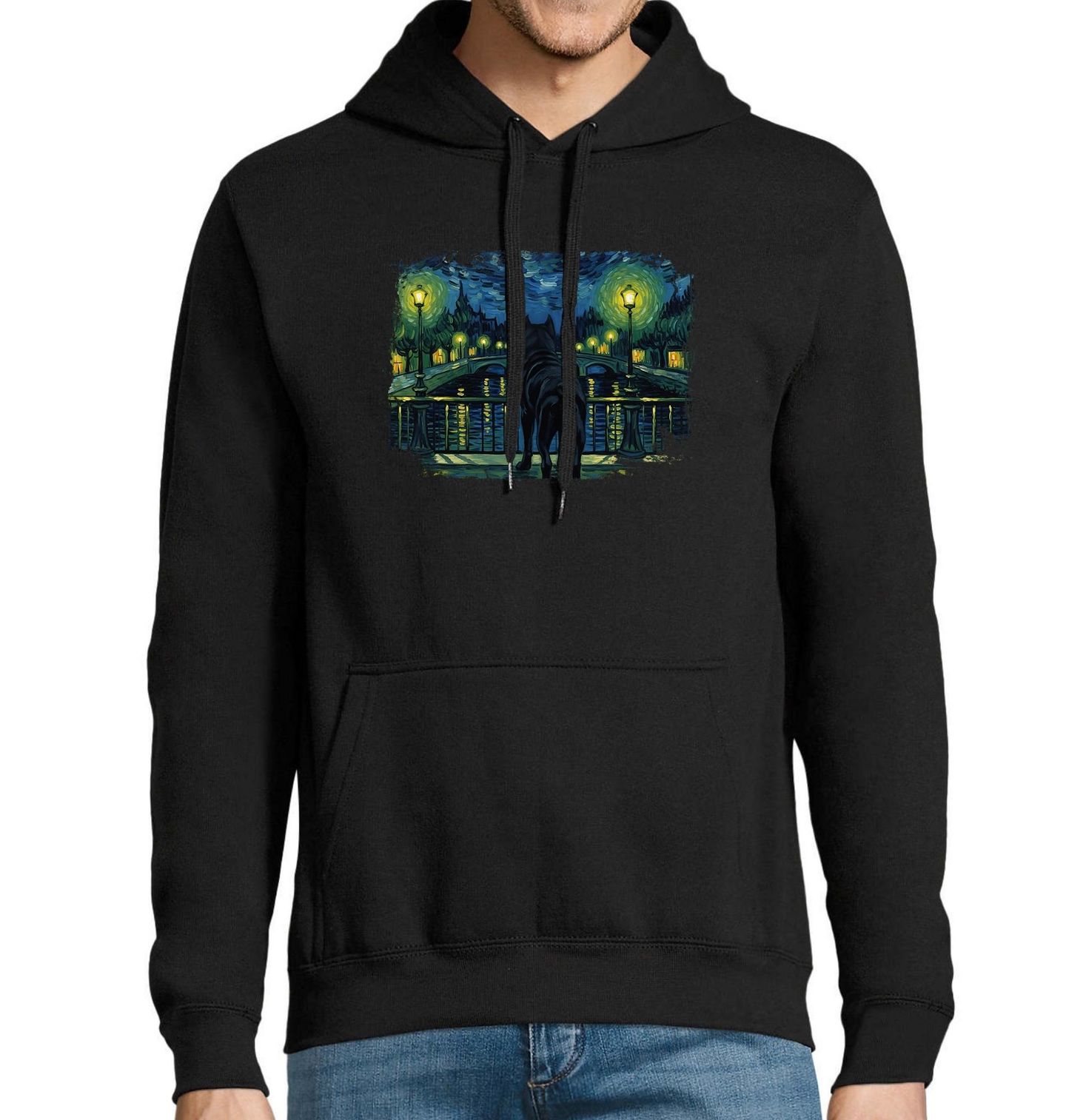Pánská mikina Cane Corso na Mostě ve Hvězdné Noci. Na ilustraci stojí pes Cane Corso na nábřeží a dívá se přes most na noční město zalité světly lamp. Celá scéna je zpracovaná ve stylu inspirovaném slavným obrazem „Hvězdná noc“ od Vincenta van Gogha – s typickými tahy štětce, výraznými barvami a snovou atmosférou.