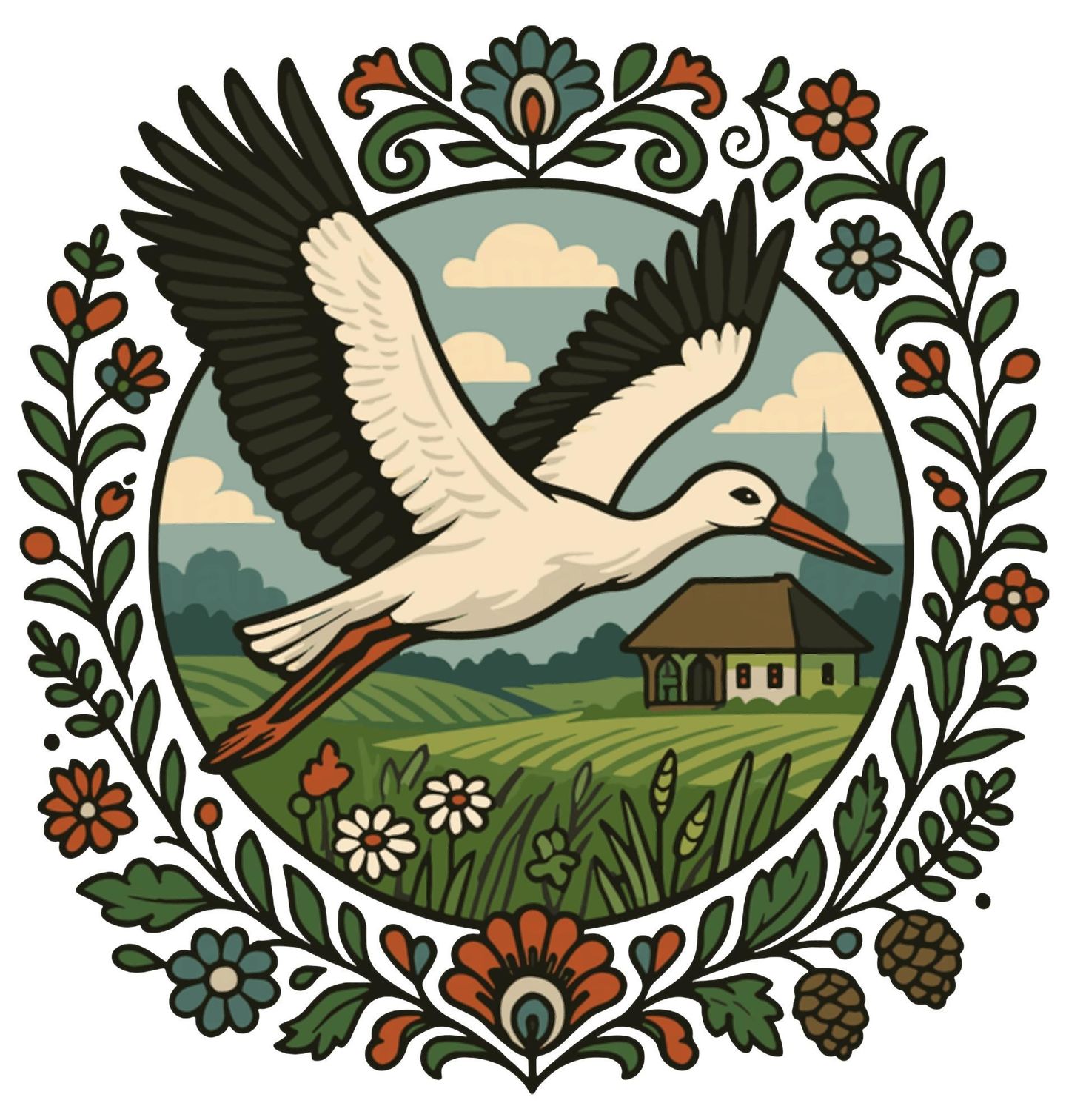 Dámské tričko Čáp bílý nad českým Venkovem Folk. Krásný motiv inspirovaný českým folklórem a tradiční venkovskou krajinou. Uprostřed zdobeného ornamentálního rámečku letí pták – čáp, symbol štěstí, rodiny a pohody. V pozadí vidíš chalupu, pole a modré kopce, které dodávají motivu klidnou a domáckou atmosféru.