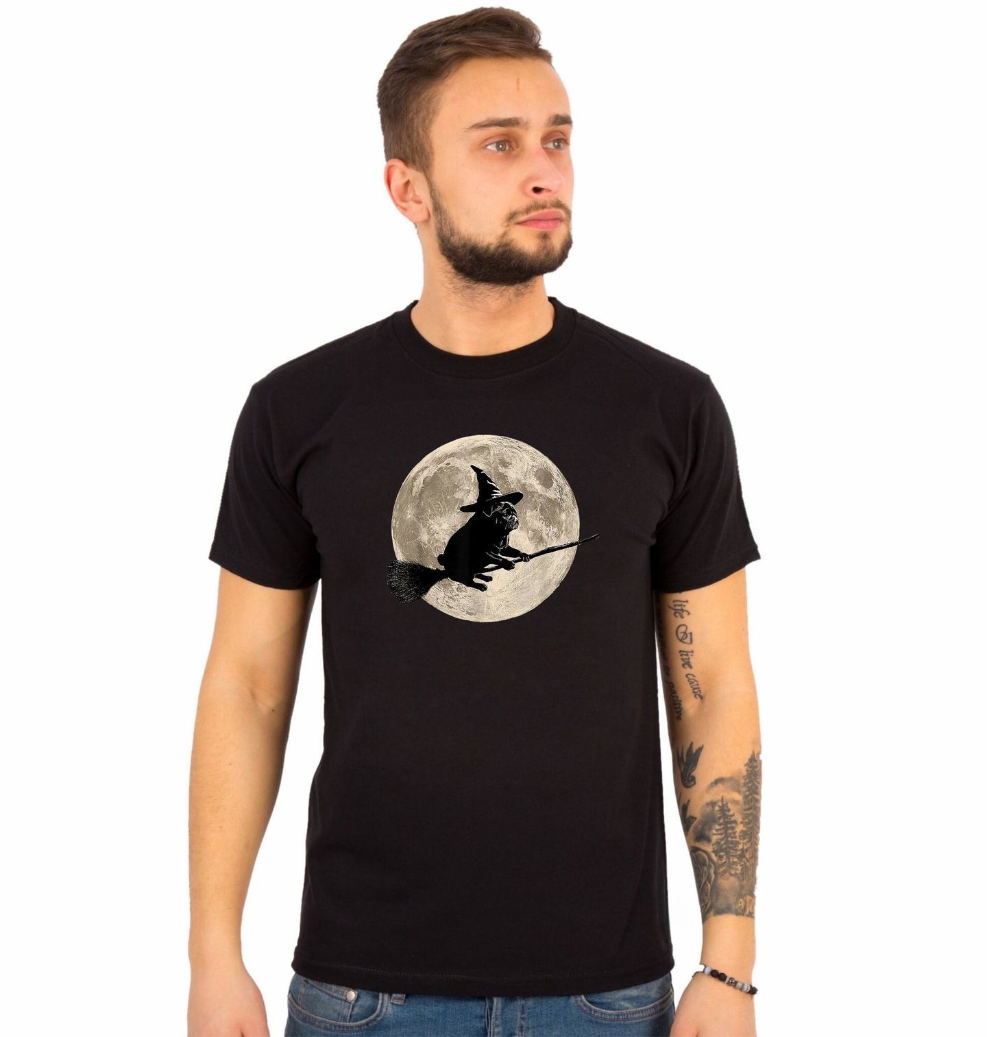 Pánské tričko Čaroděj Mops na Létajícím Koštěti. Originální a hravý motiv, na kterém je pes v roli kouzelníka – čaroděj letící na koštěti před zářivým úplňkem. Siluetu tvoří roztomilý mops, takže každý pejskař si tenhle design hned zamiluje. Velký realistický měsíc v pozadí dodává motivu tajemnou, ale zároveň vtipnou atmosféru.