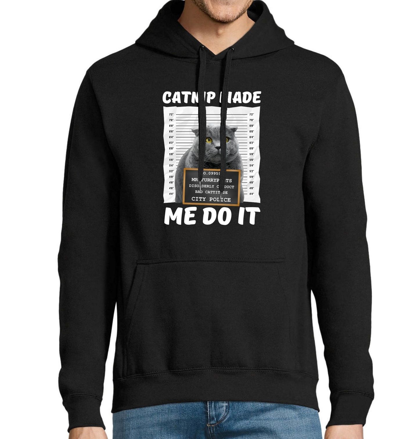 Pánská mikina Catnip Made Me Do It Kočka Busted. Tahle kočička sice vypadá nevinně, ale právě byla zadržena za výtržnosti způsobené neodolatelným catnipem. Perfektní dárek pro každého, kdo zná ty malé kočičí lumpárny, kterým nelze odolat.