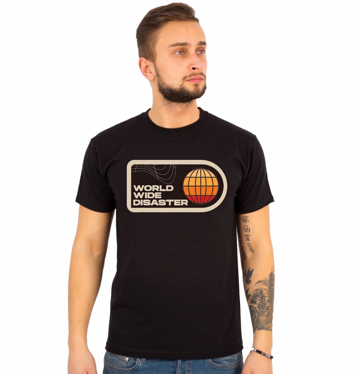 Pánské tričko Celosvětová Katastrofa World Wide Disaster. Retro design s výrazným nápisem „World Wide Disaster“ (Celosvětová katastrofa) kombinuje vintage barevnost a minimalistický globus. Tento design působí ironicky i stylově zároveň a je ideální pro ty, kteří mají rádi výrazné a lehce provokativní motivy.