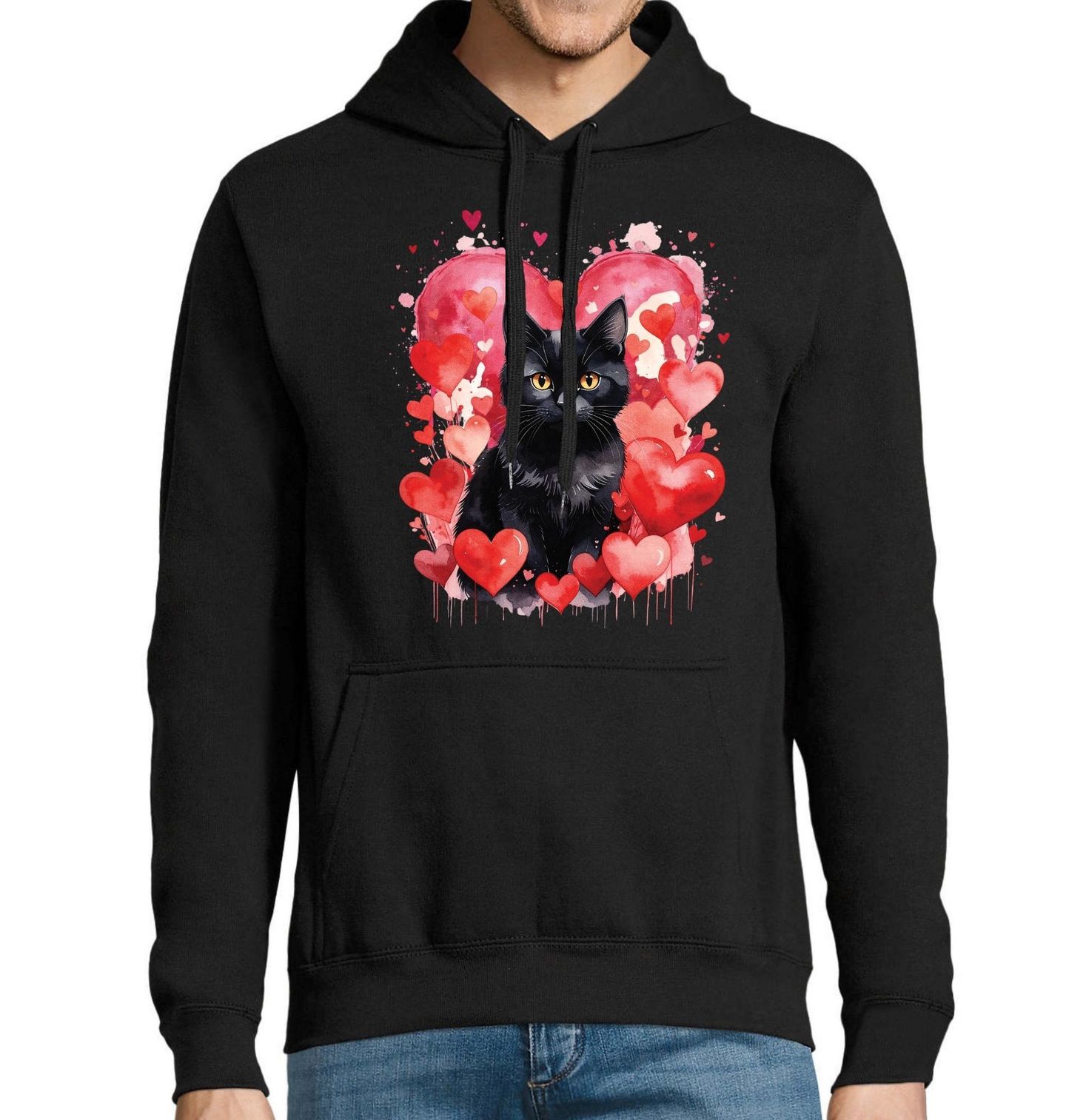 Pánská mikina Černá Bombajská Kočka mezi Srdci. Motiv nejlépe odpovídá bombajské kočce – celistvě černá srst, výrazné zlaté oči a elegantní, hladká silueta. Srdce v pozadí zvýrazňují kontrast mezi jemností lásky a silnou osobností, kterou tato kočka vyzařuje. Bombajská kočka je symbolem elegance, oddanosti a klidné síly.