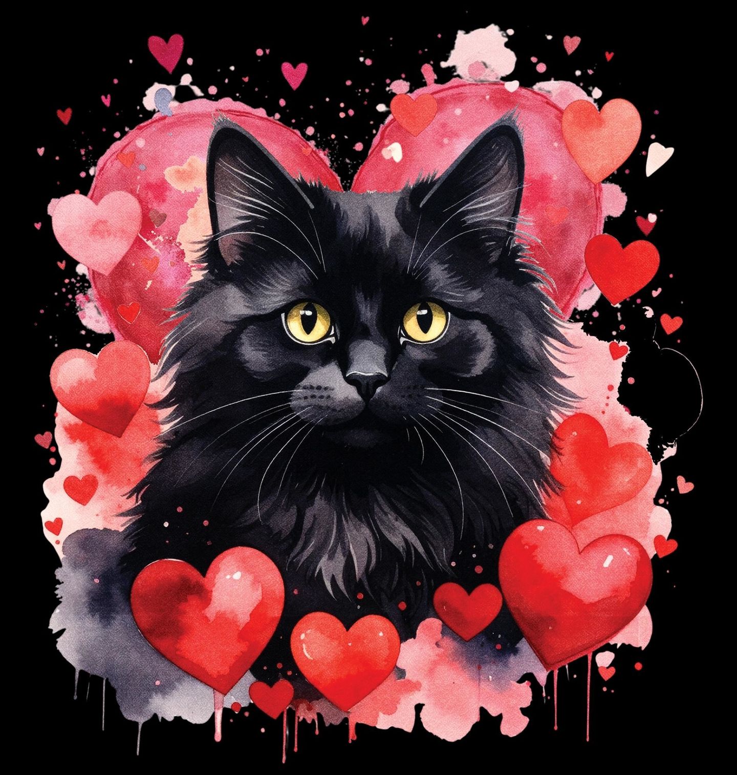 Pánské tričko Černá Dlouhosrstá Kočka mezi Srdci. Tento výrazný akvarelový motiv zachycuje kočka s černou dlouhou srstí, obklopenou srdci, která symbolizují lásku, tajemství a eleganci. Černá kočka je po staletí považována za mystickou a výjimečnou – v tomto provedení působí jemně, hřejivě a romanticky.