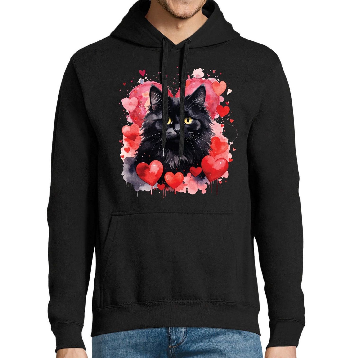 Pánská mikina Černá Dlouhosrstá Kočka mezi Srdci. Tento výrazný akvarelový motiv zachycuje kočka s černou dlouhou srstí, obklopenou srdci, která symbolizují lásku, tajemství a eleganci. Černá kočka je po staletí považována za mystickou a výjimečnou – v tomto provedení působí jemně, hřejivě a romanticky.